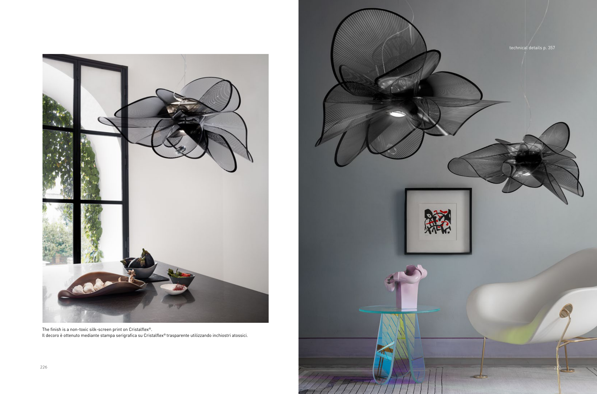 227 226 The finish is a non-toxic silk-screen print on Cristalflex®. Il decoro è ottenuto mediante stampa serigrafica su Cristalflex® trasparente utilizzando inchiostri atossici. 227 technical details p. 357