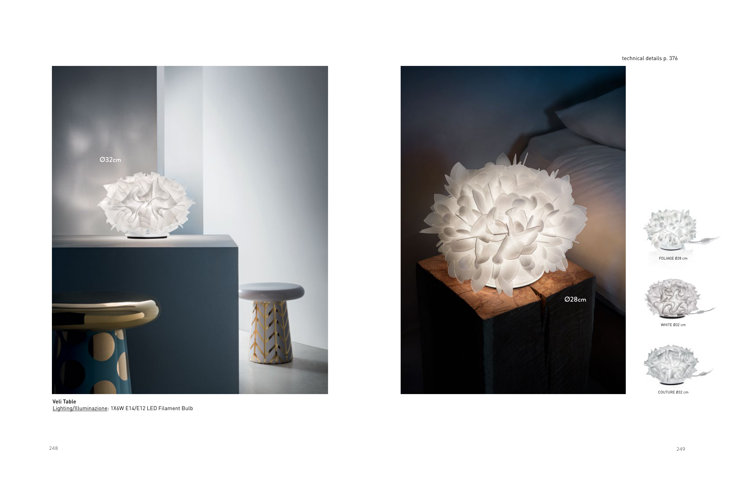 249 248 Veli Table Lighting/Illuminazione: 1X6W E14/E12 LED Filament Bulb Ø32cm COUTURE Ø32 cm WHITE Ø32 cm FOLIAGE Ø28 cm Ø28cm technical details p. 376