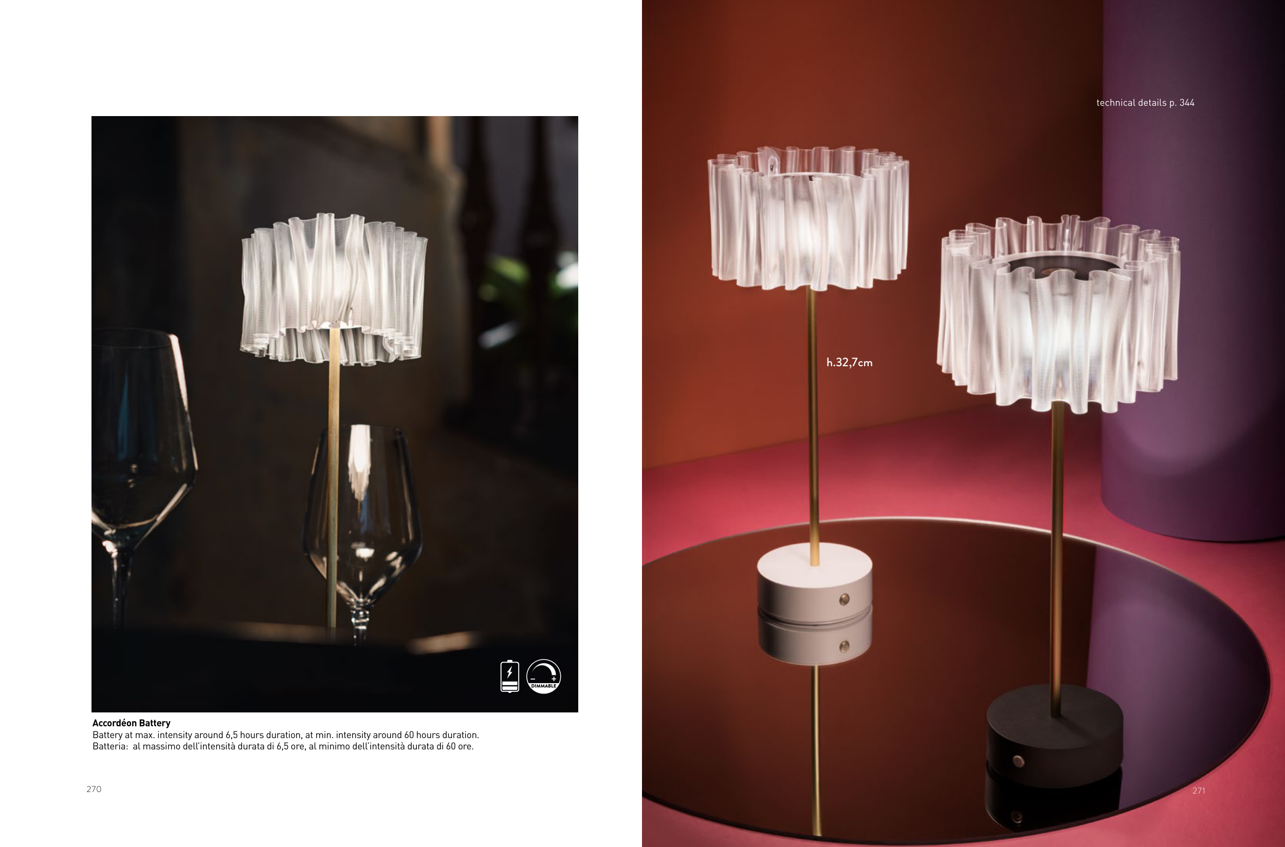 270 Accordéon Battery Battery at max. intensity around 6,5 hours duration, at min. intensity around 60 hours duration. Batteria: al massimo dell’intensità durata di 6,5 ore, al minimo dell’intensità durata di 60 ore. 271 h.32,7cm technical details p. 344