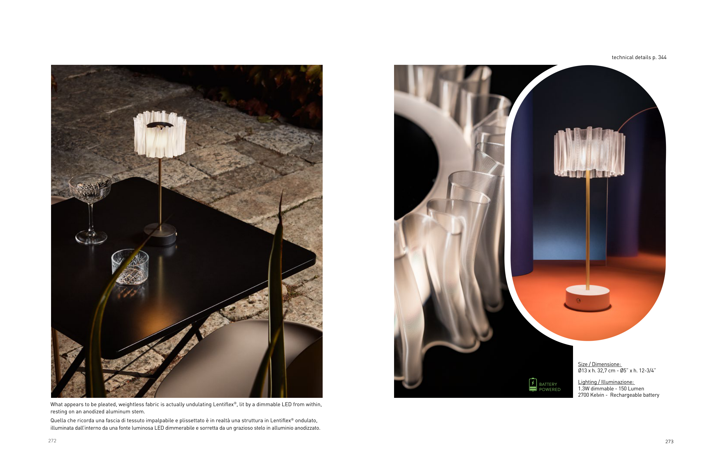 illuminata dall’interno da una fonte luminosa LED dimmerabile e sorretta da un grazioso stelo in alluminio anodizzato.