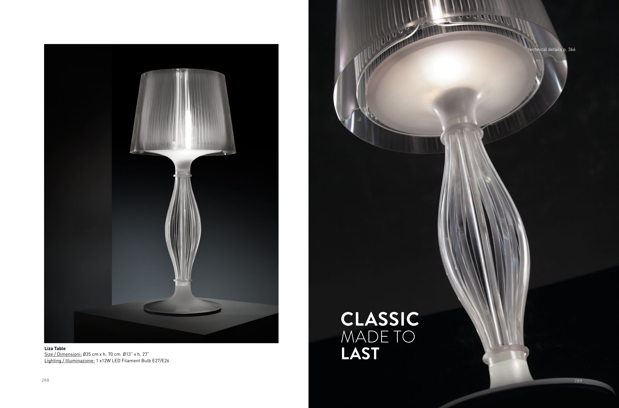 288 289 technical details p. 366 CLASSIC MADE TO LAST Liza Table Size / Dimensioni: Ø35 cm x h. 70 cm Ø13” x h. 27” Lighting / Illuminazione: 1 x12W LED Filament Bulb E27/E26