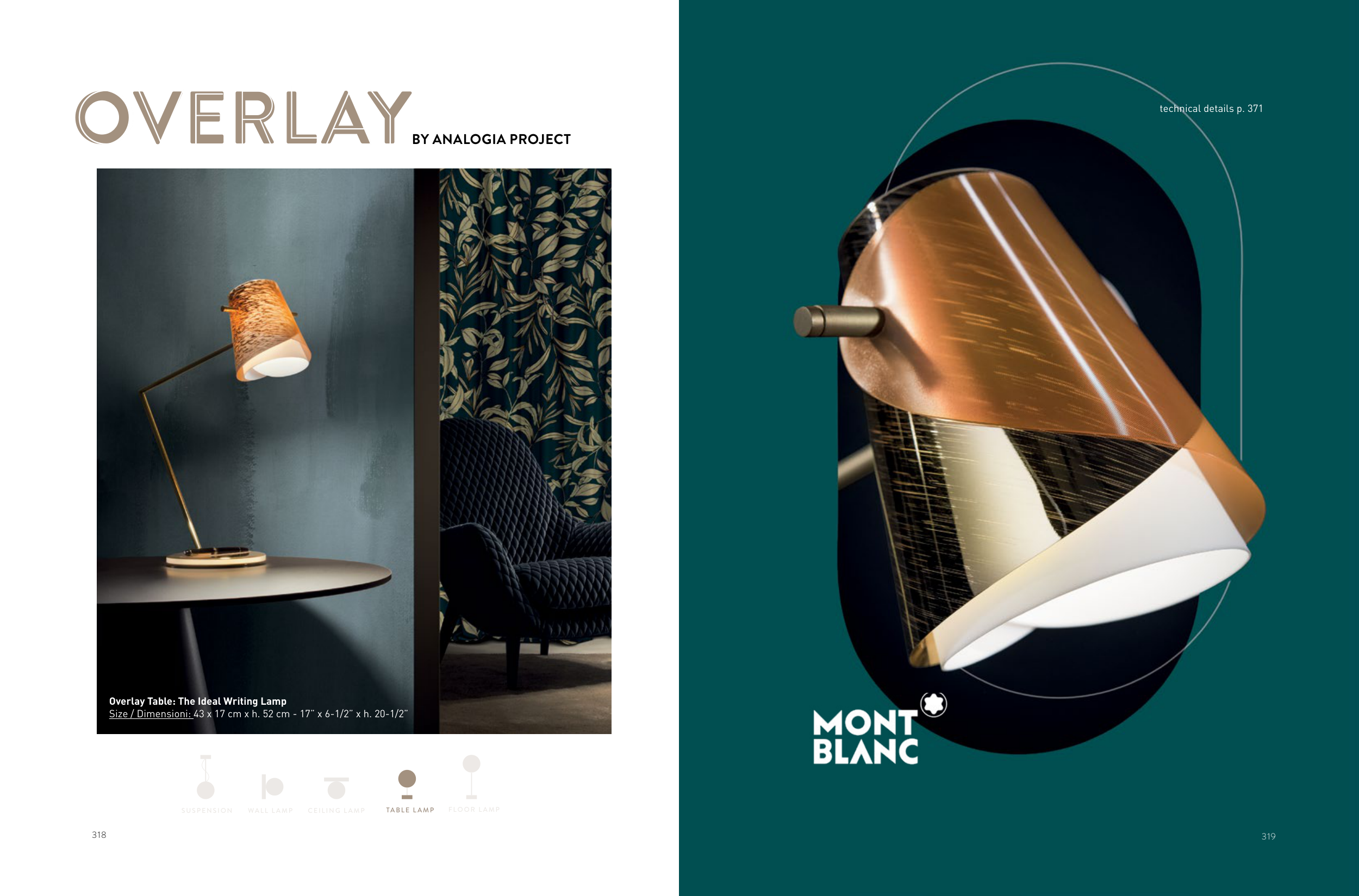 318 Overlay Table: The Ideal Writing Lamp Size / Dimensioni: 43 x 17 cm x h. 52 cm - 17” x 6-1/2” x h. 20-1/2” CEILING L AMP WALL L AMP TABLE L AMP FLOOR L AMP SUSPENSION OVERLAY A L OV BY ANALOGIA PROJECT 319 technical details p. 371
