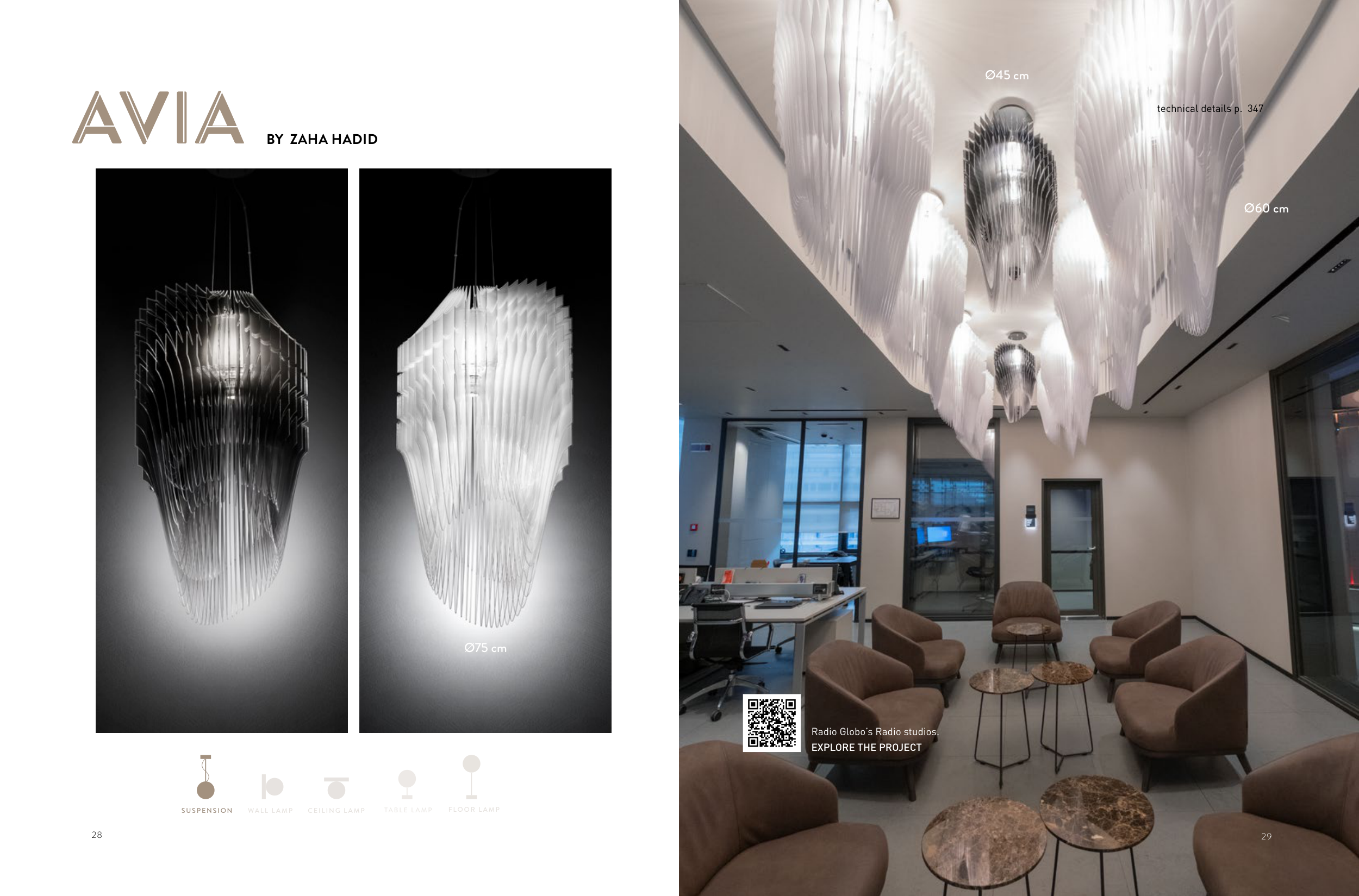 29 28 CEILING L AMP WALL L AMP TABLE L AMP FLOOR L AMP SUSPENSION AVIA A A V BY ZAHA HADID Ø75 cm 29 Radio Globo’s Radio studios. EXPLORE THE PROJECT Ø60 cm Ø45 cm technical details p. 347
