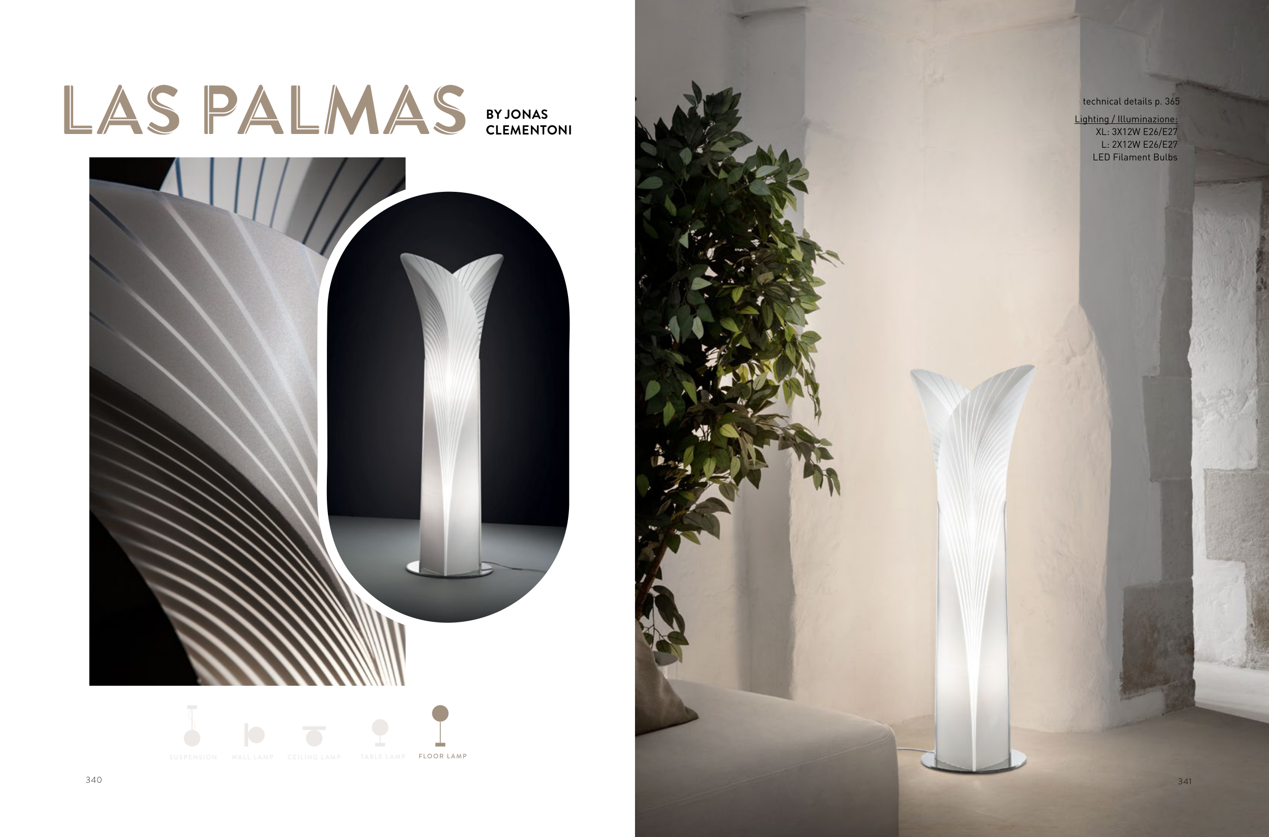 340 CEILING L AMP WALL L AMP TABLE L AMP FLOOR L AMP SUSPENSION LAS PALMAS A A A L L BY JONAS CLEMENTONI technical details p. 365 Lighting / Illuminazione: XL: 3X12W E26/E27 L: 2X12W E26/E27 LED Filament Bulbs 341