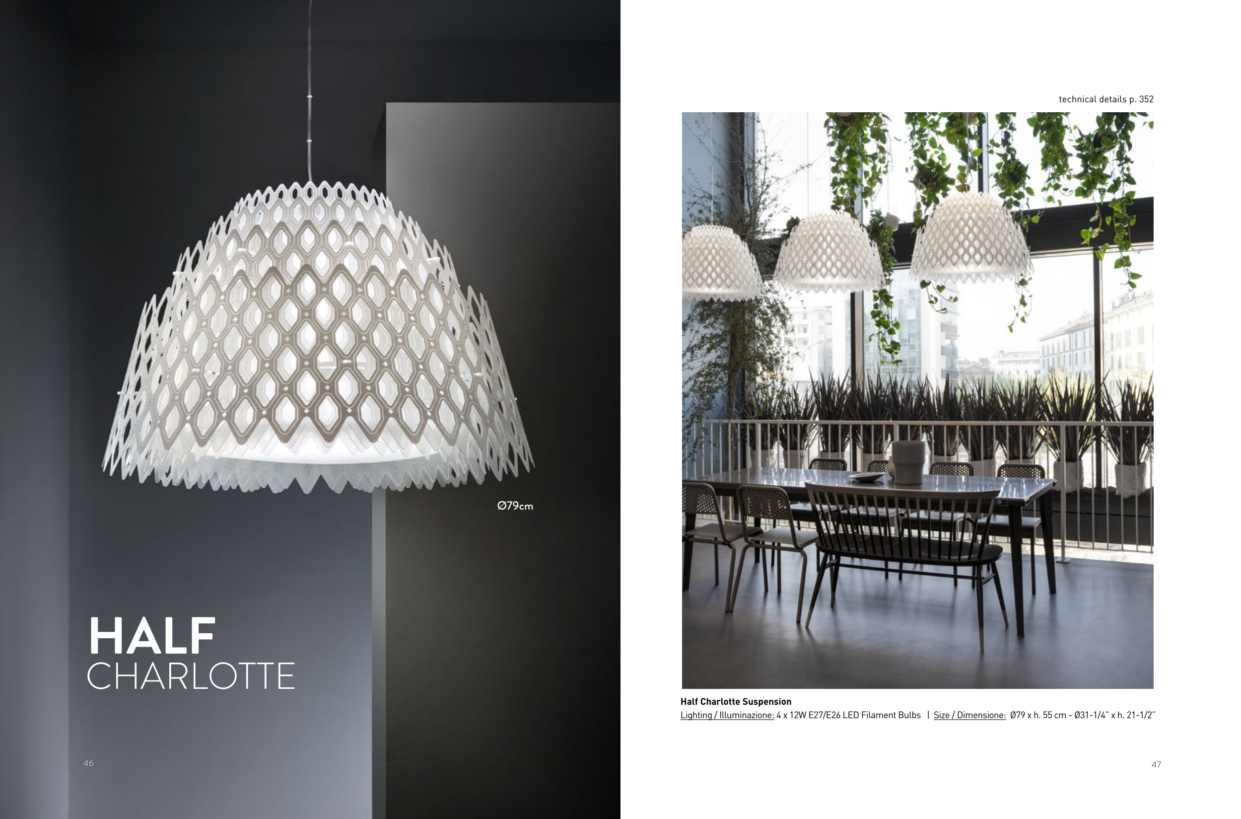 47 46 CHARLOTTE HALF Ø79cm Half Charlotte Suspension Lighting / Illuminazione: 4 x 12W E27/E26 LED Filament Bulbs | Size / Dimensione: Ø79 x h. 55 cm - Ø31-1/4” x h. 21-1/2” technical details p. 352