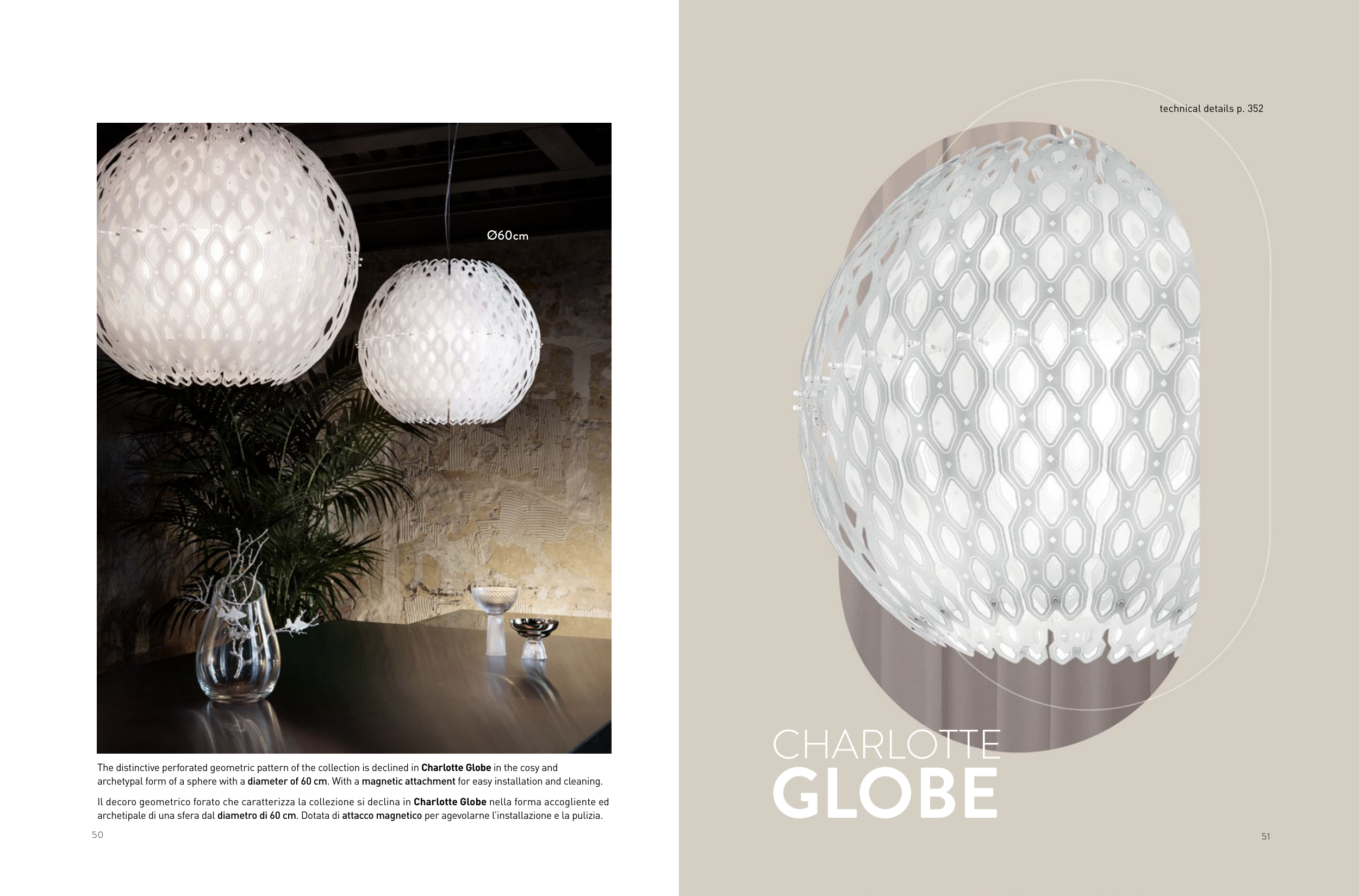 Il decoro geometrico forato che caratterizza la collezione si declina in Charlotte Globe nella forma accogliente ed