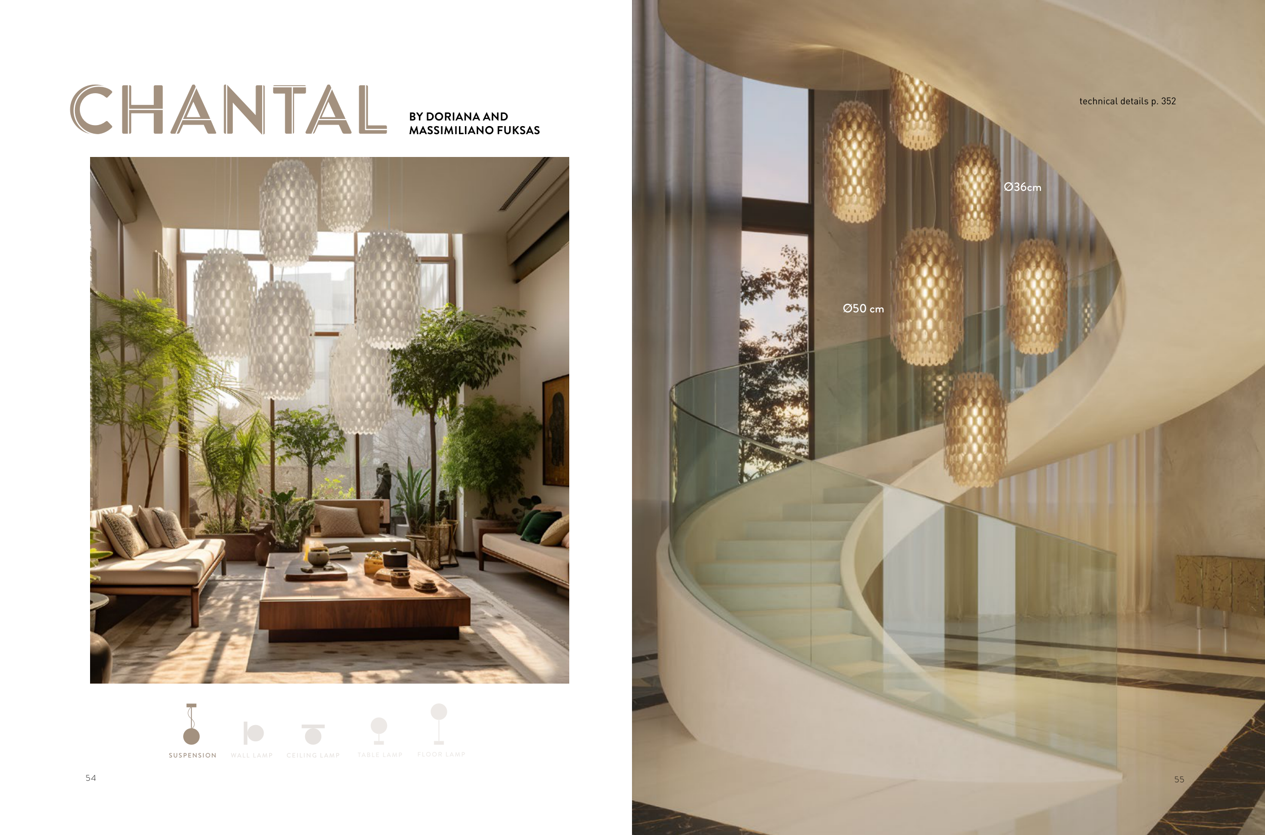 55 54 CEILING L AMP WALL L AMP TABLE L AMP FLOOR L AMP SUSPENSION CHANTAL A C AL BY DORIANA AND MASSIMILIANO FUKSAS 55 Ø36cm Ø50 cm technical details p. 352