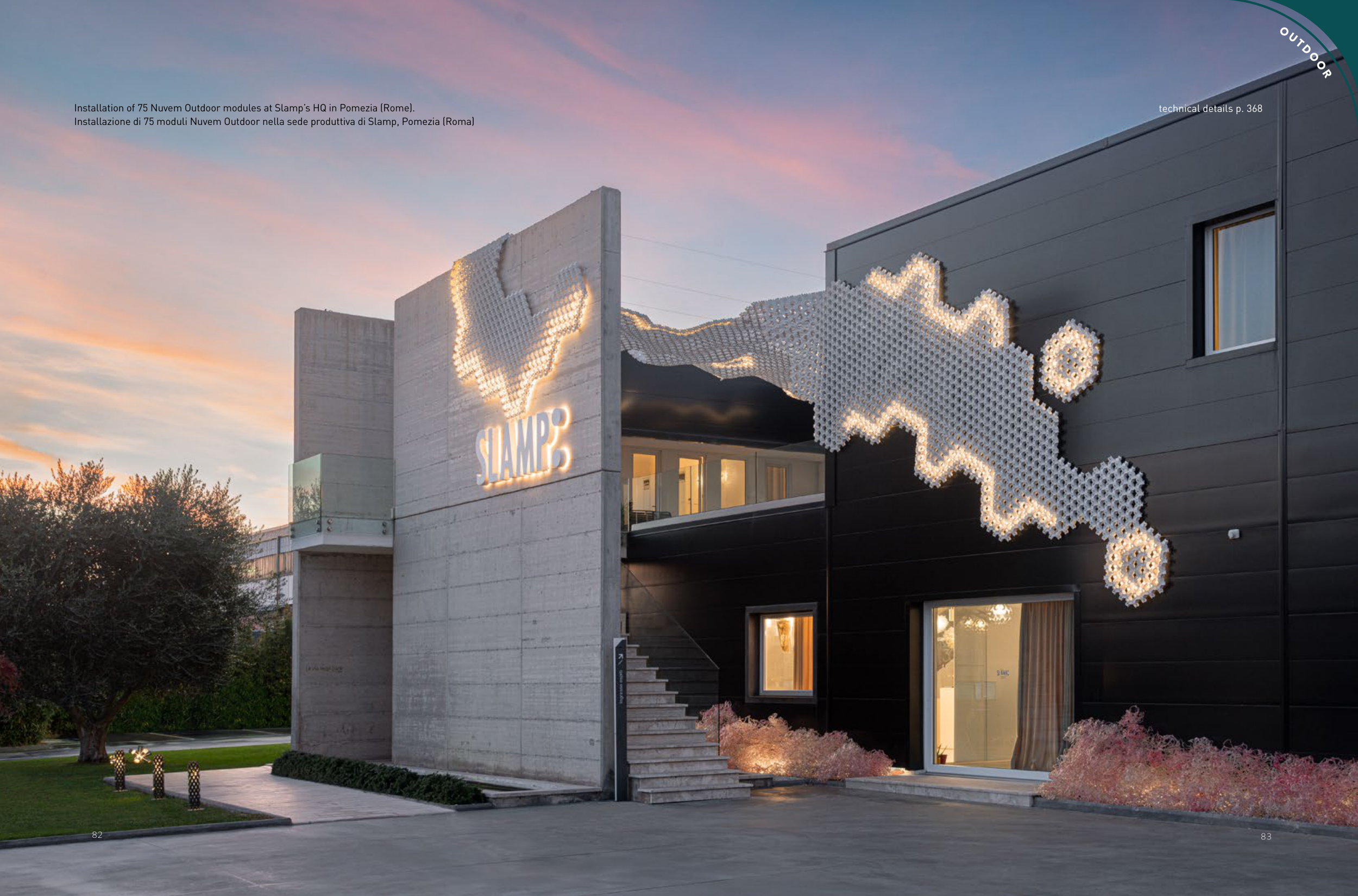 83 82 82 Installation of 75 Nuvem Outdoor modules at Slamp’s HQ in Pomezia (Rome). Installazione di 75 moduli Nuvem Outdoor nella sede produttiva di Slamp, Pomezia (Roma) O U T D O O R 83 technical details p. 368