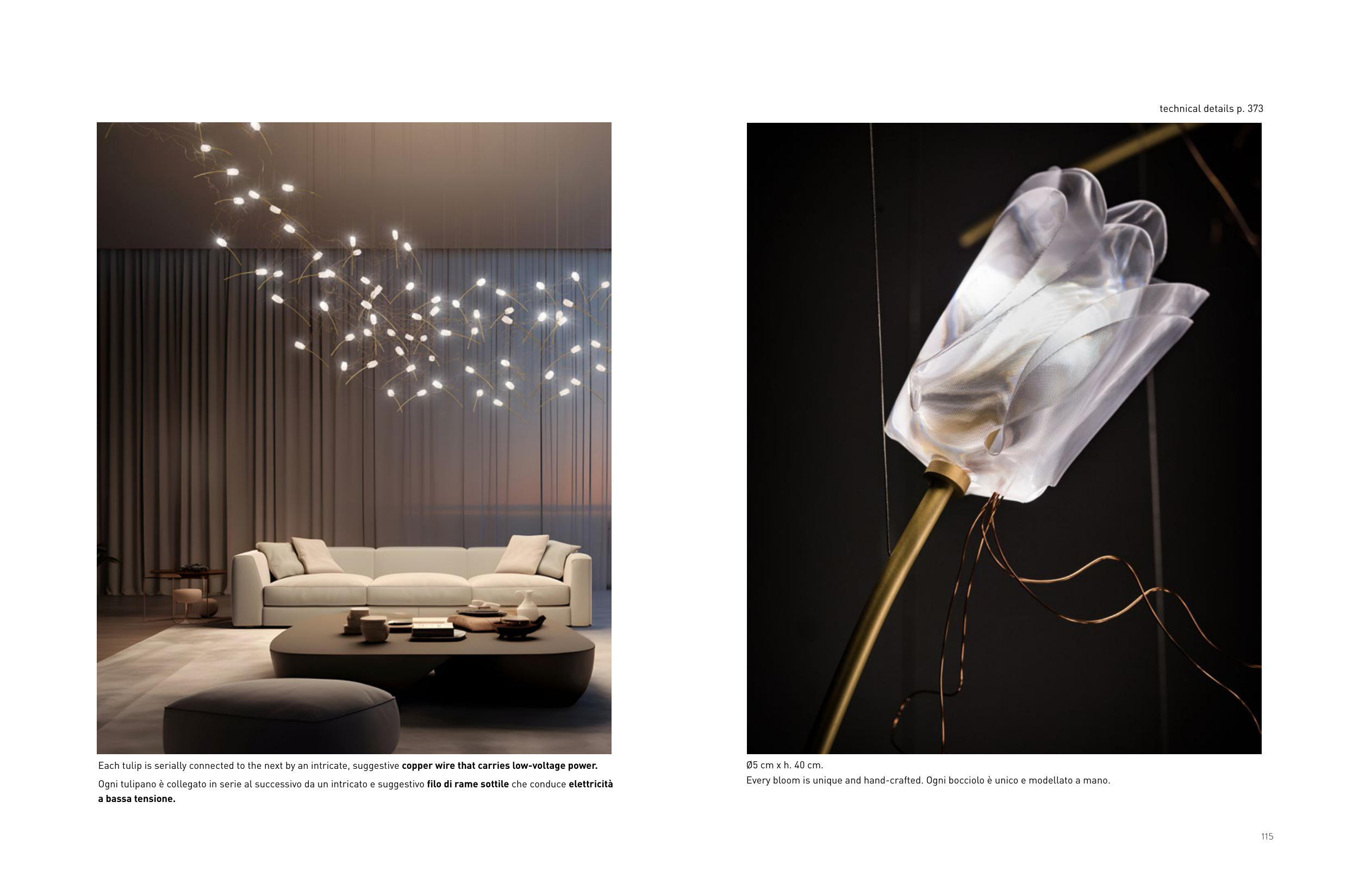 Ogni tulipano è collegato in serie al successivo da un intricato e suggestivo filo di rame sottile che conduce elettricità