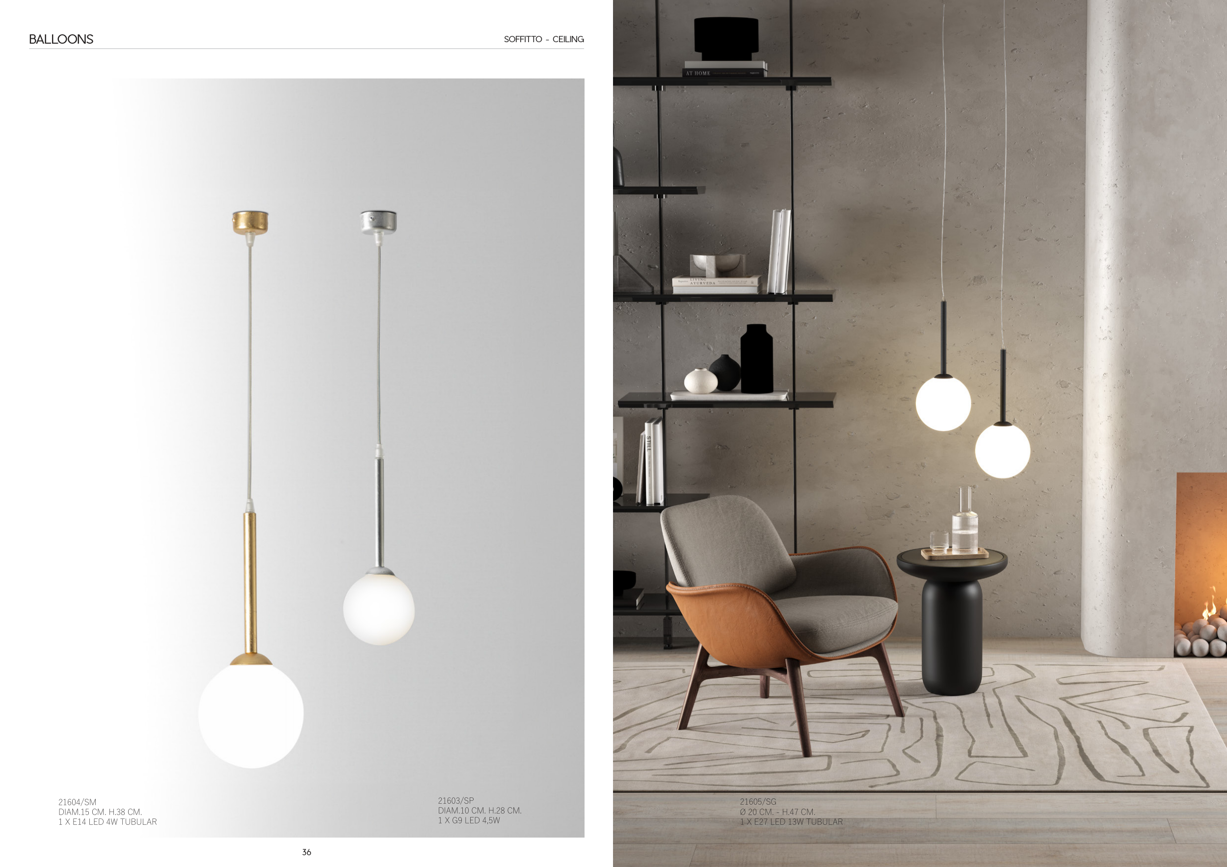 37 36 21605/SG Ø 20 CM. - H.47 CM. 1 X E27 LED 13W TUBULAR BALLOONS SOFFITTO - CEILING 21604/SM DIAM.15 CM. H.38 CM. 1 X E14 LED 4W TUBULAR 21603/SP DIAM.10 CM. H.28 CM. 1 X G9 LED 4,5W