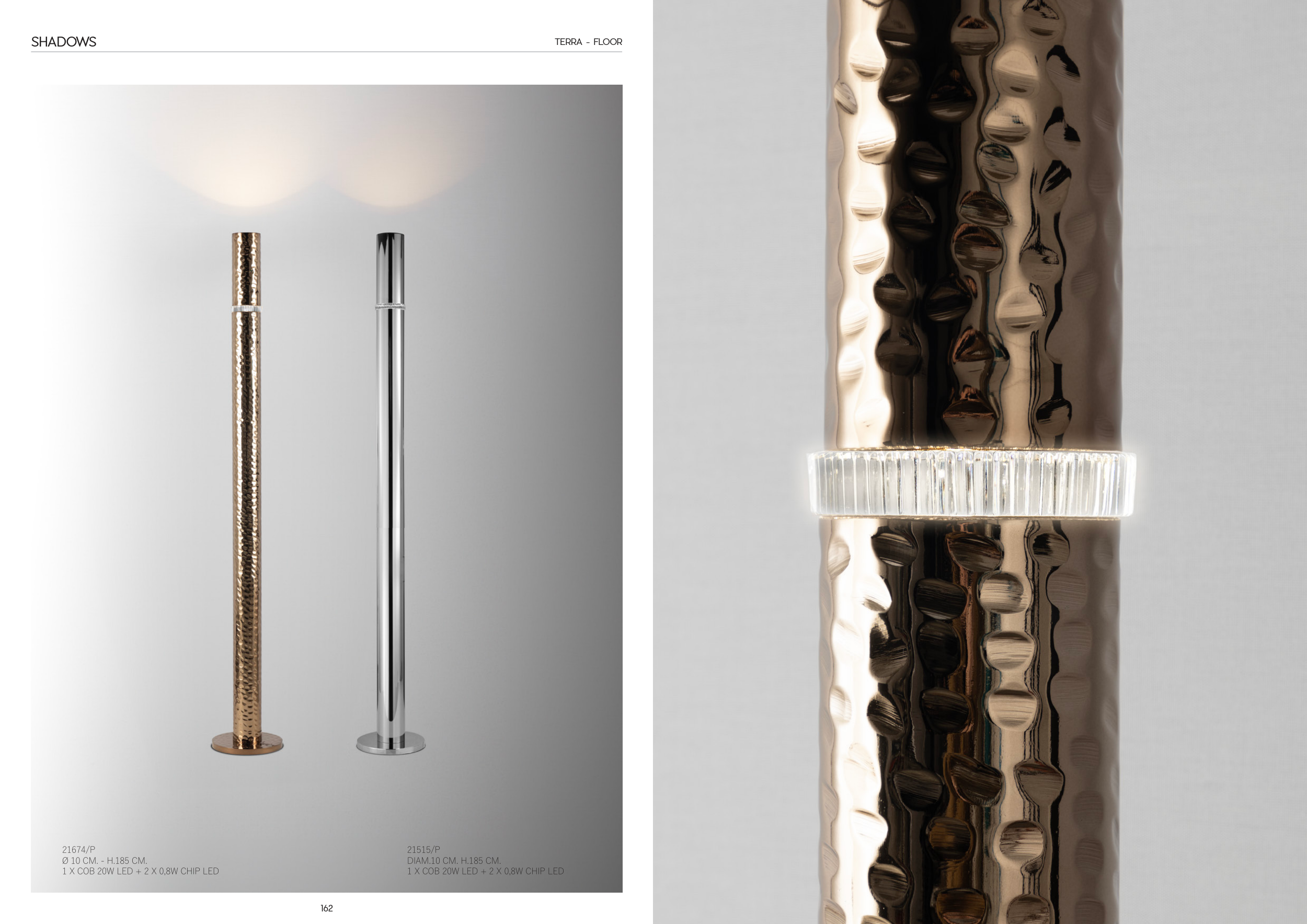 162 163 SHADOWS 21674/P Ø 10 CM. - H.185 CM. 1 X COB 20W LED + 2 X 0,8W CHIP LED 21515/P DIAM.10 CM. H.185 CM. 1 X COB 20W LED + 2 X 0,8W CHIP LED TERRA - FLOOR