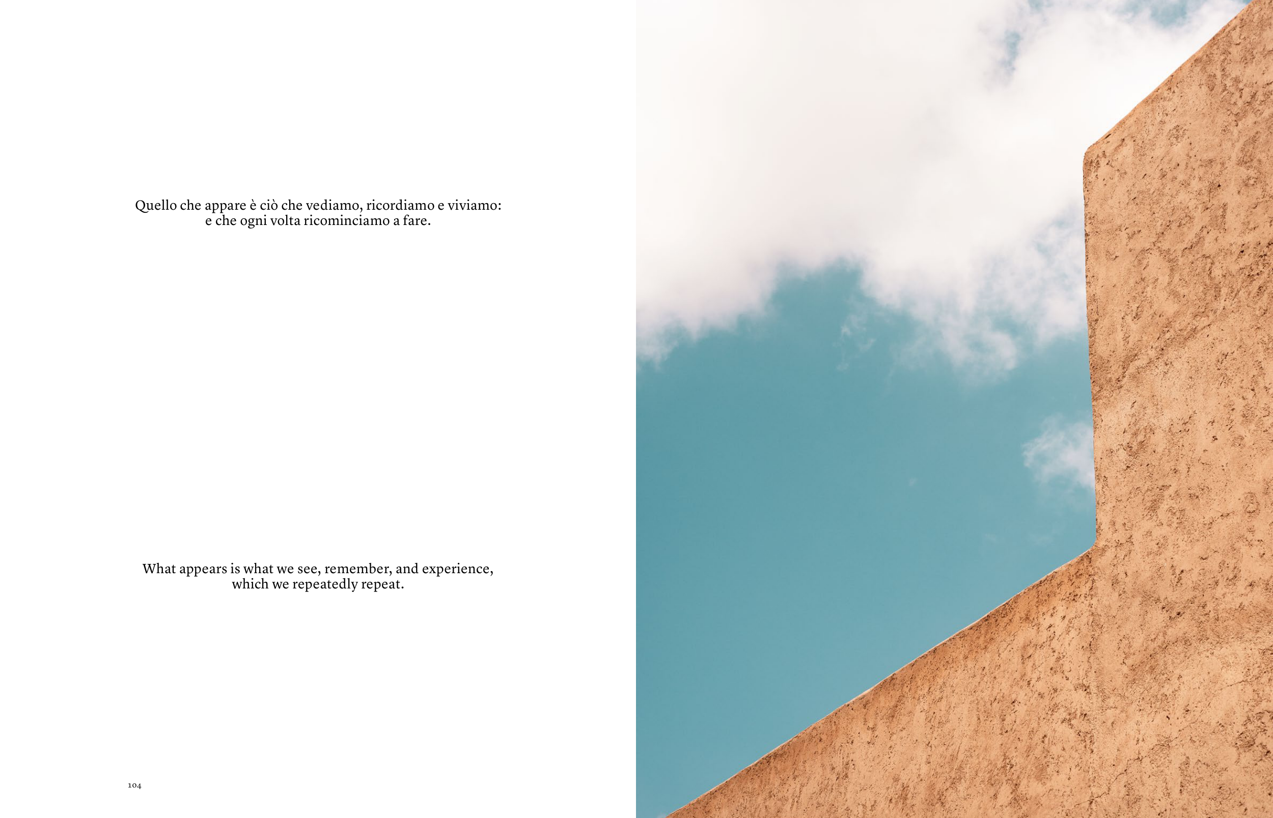 104 105 What appears is what we see, remember, and experience, which we repeatedly repeat. Quello che appare è ciò che vediamo, ricordiamo e viviamo: e che ogni volta ricominciamo a fare.