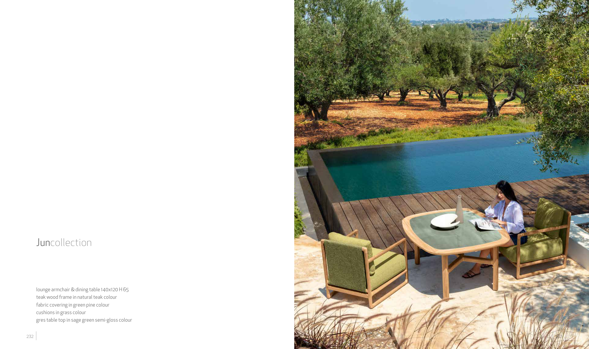 lounge armchair & dining table 140x120 H 65 teak wood frame in natural teak colour fabric covering in green pine colour cushions in grass colour gres table top in sage green semi-gloss colour Juncollection 232 233