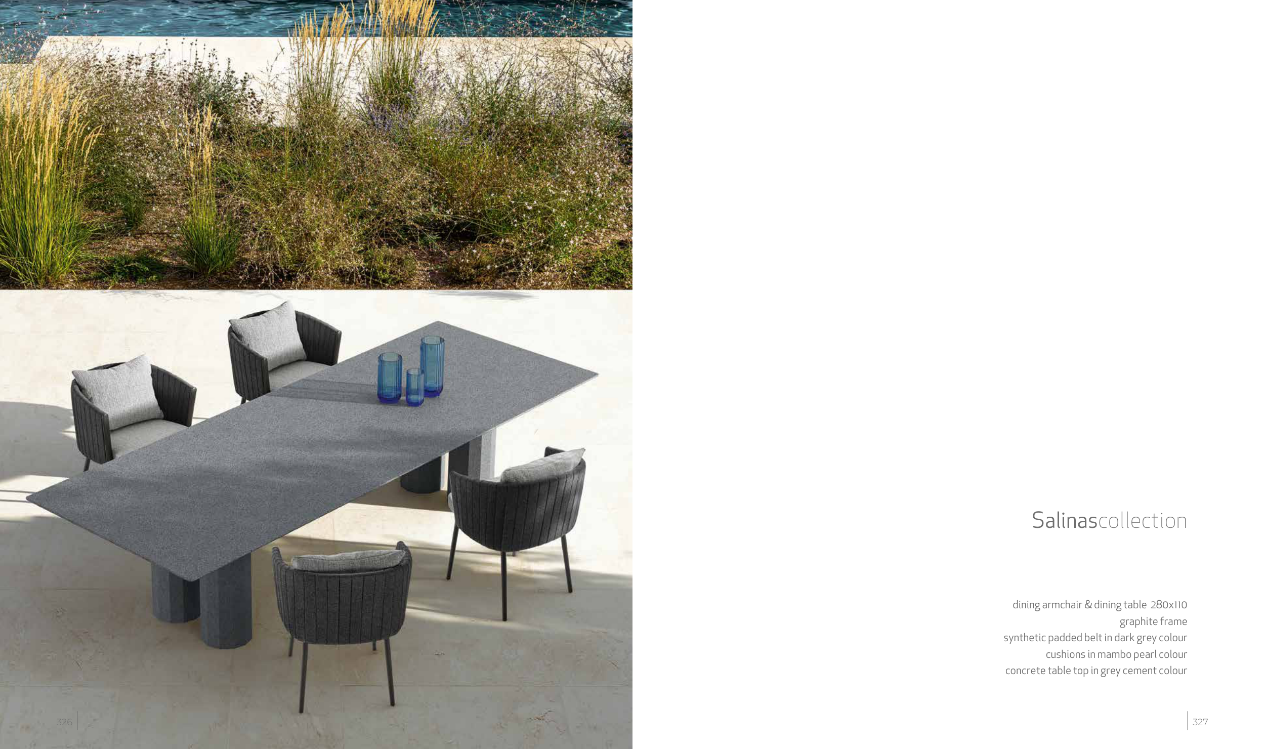 dining armchair & dining table 280x110 graphite frame synthetic padded belt in dark grey colour cushions in mambo pearl colour concrete table top in grey cement colour Salinascollection 326 327