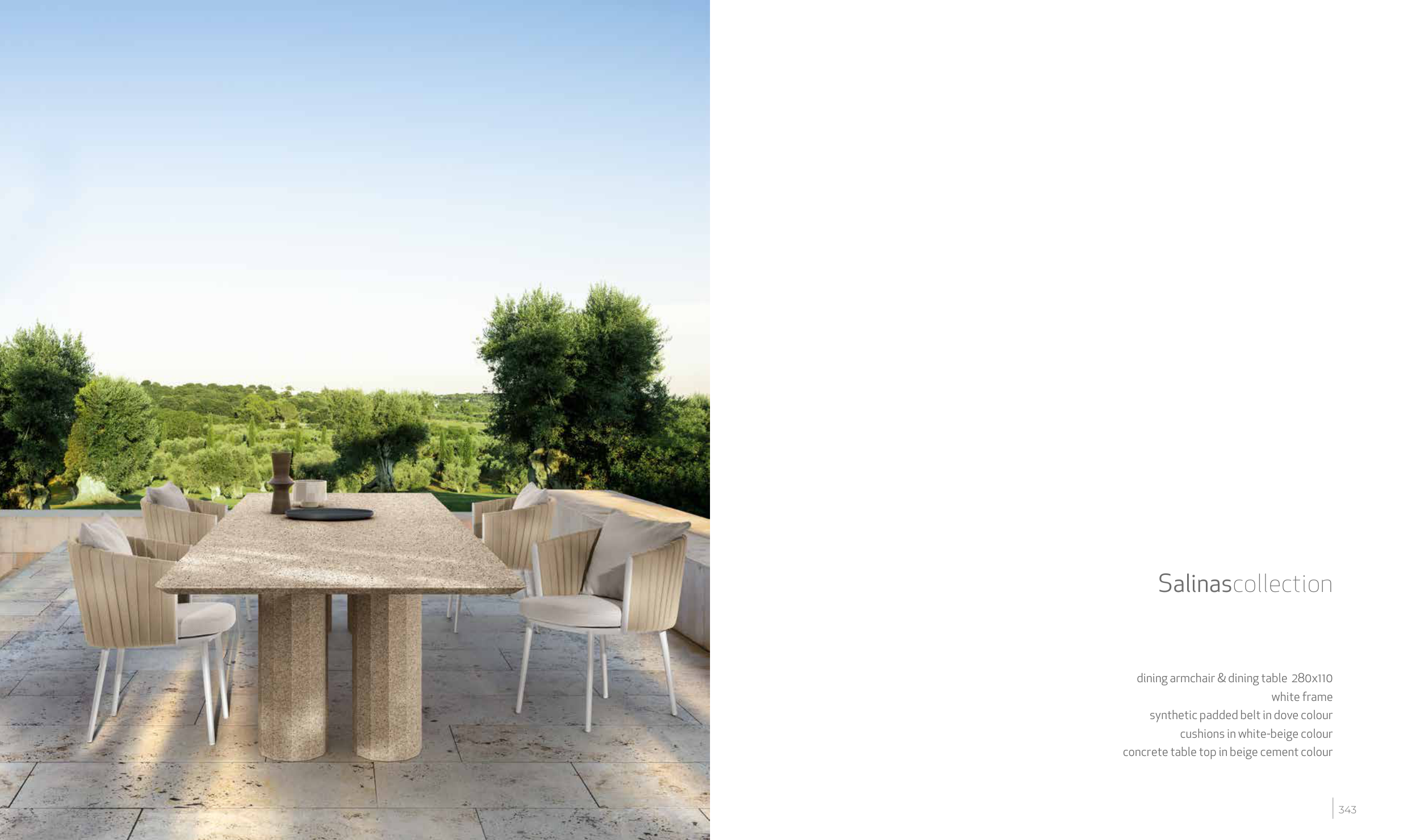 Salinascollection dining armchair & dining table 280x110 white frame synthetic padded belt in dove colour cushions in white-beige colour concrete table top in beige cement colour 342 343