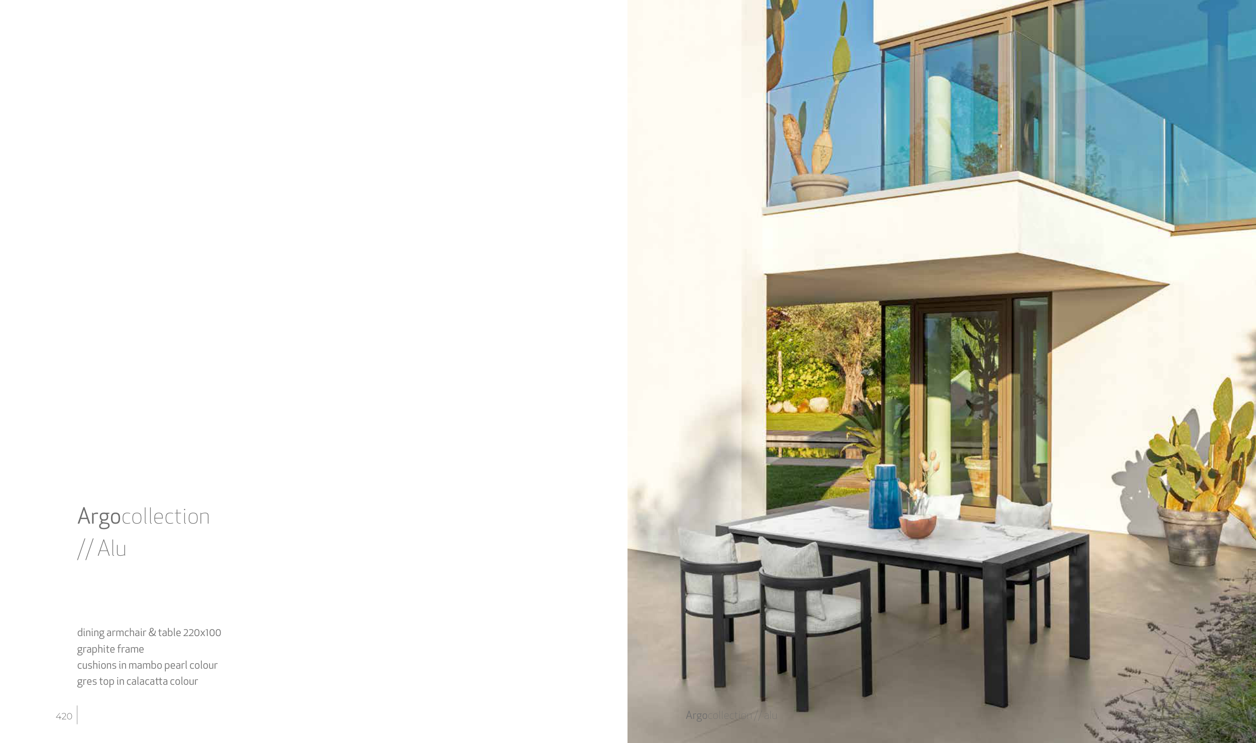 Argocollection // alu Argocollection // Alu dining armchair & table 220x100 graphite frame cushions in mambo pearl colour gres top in calacatta colour 420 421