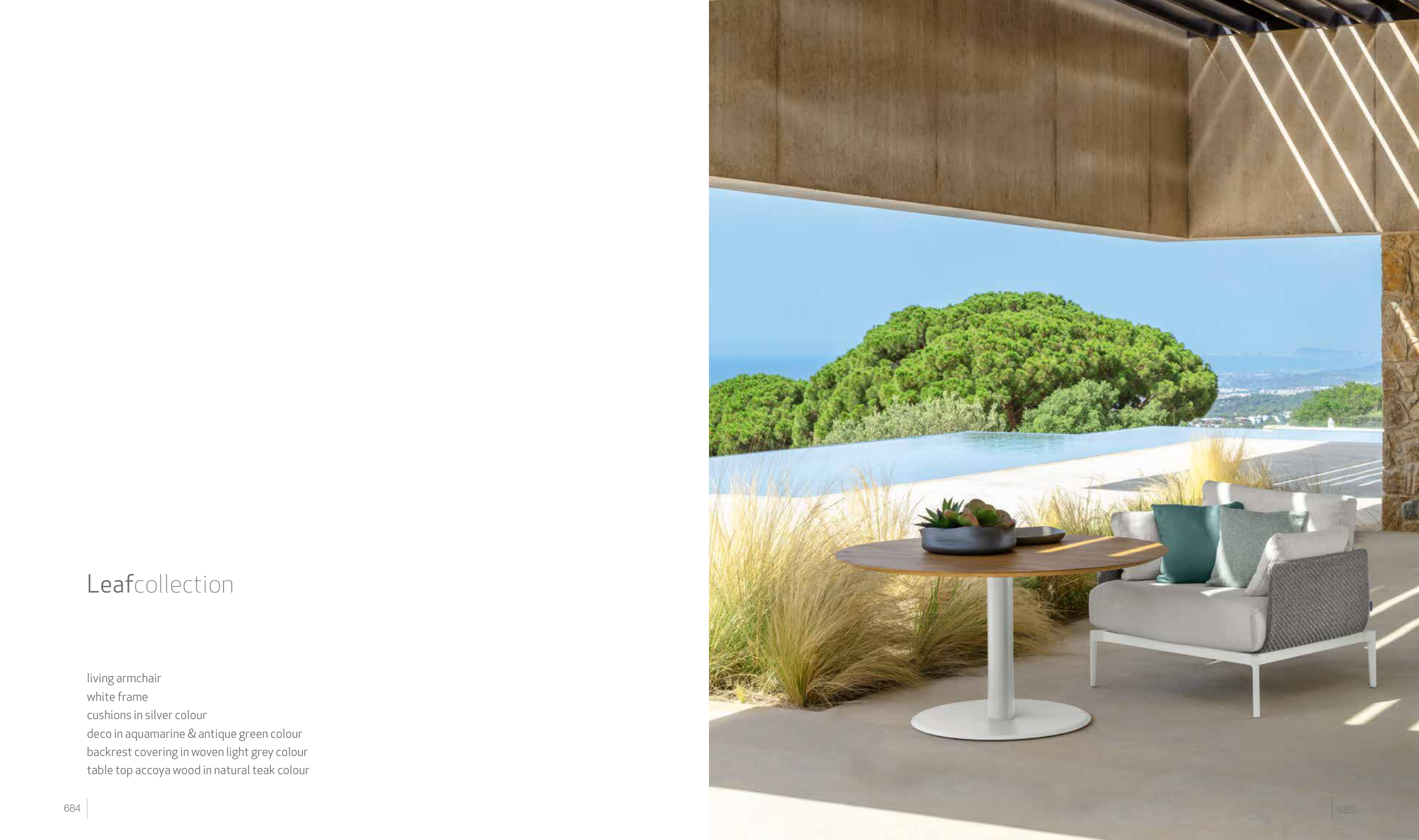 Leafcollection living armchair white frame cushions in silver colour deco in aquamarine & antique green colour backrest covering in woven light grey colour table top accoya wood in natural teak colour 685 684