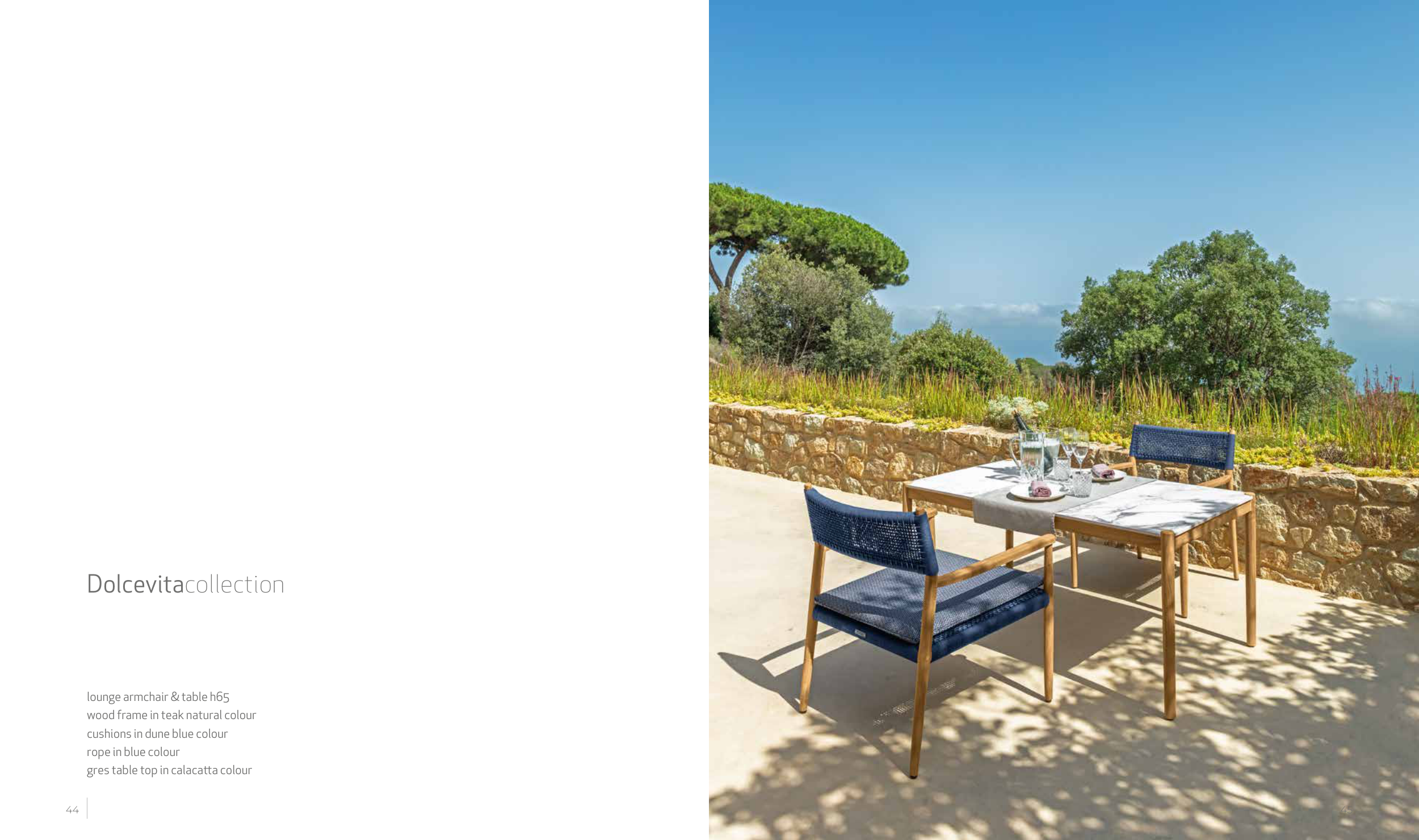 Dolcevitacollection lounge armchair & table h65 wood frame in teak natural colour cushions in dune blue colour rope in blue colour gres table top in calacatta colour 45 44