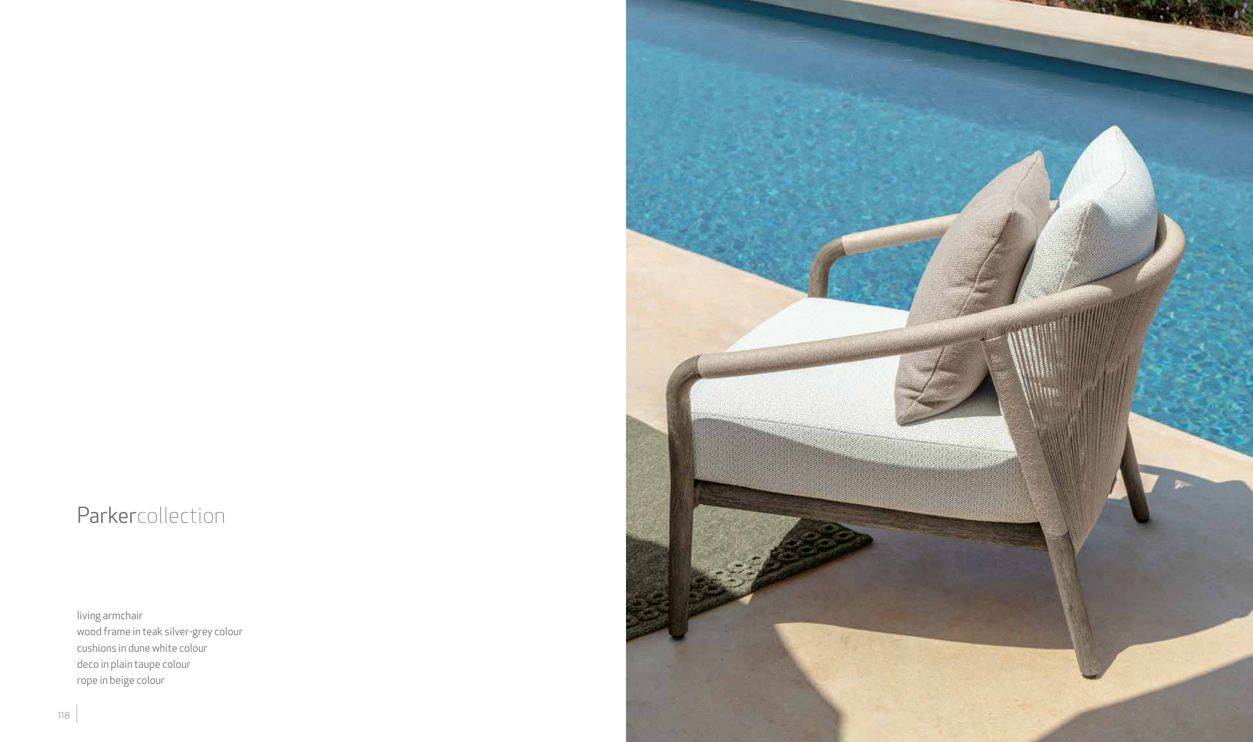 Parkercollection living armchair wood frame in teak silver-grey colour cushions in dune white colour deco in plain taupe colour rope in beige colour 118 119