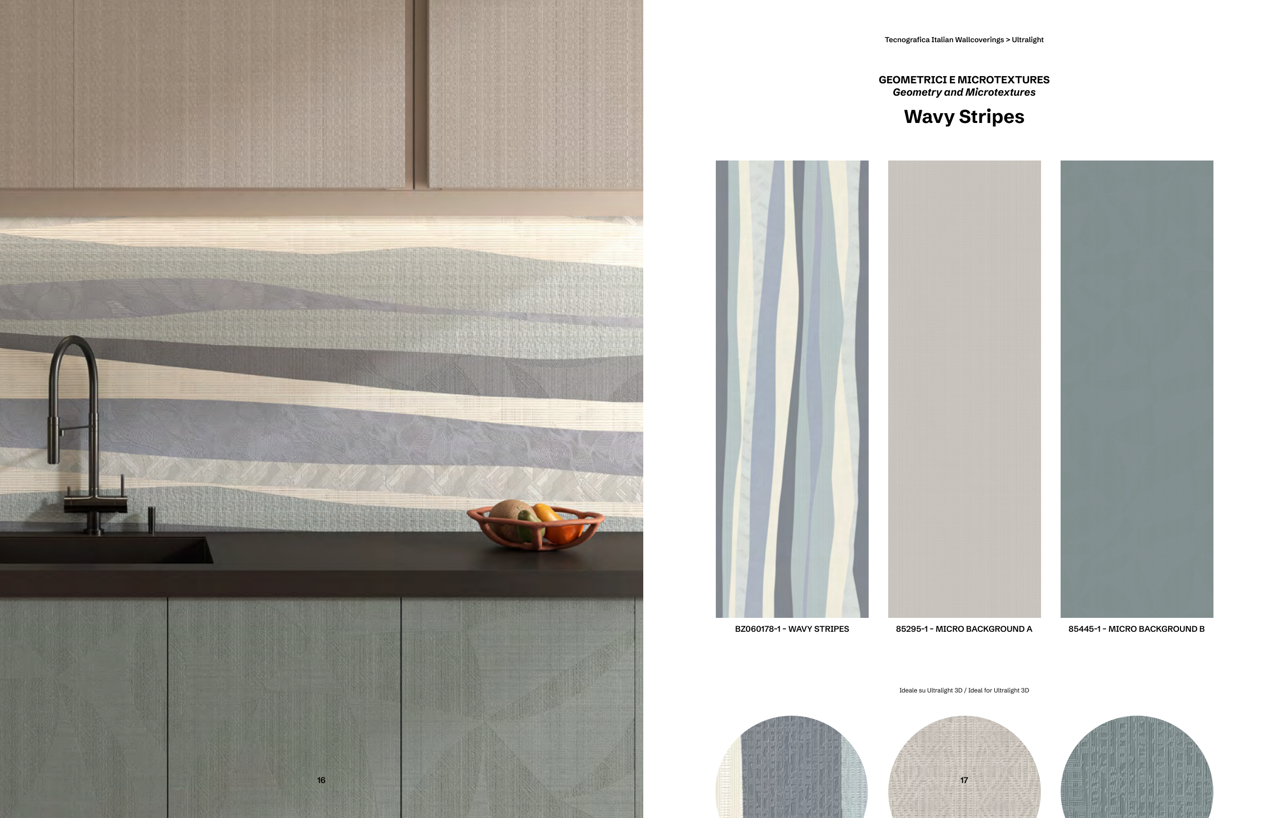 85295-1 – MICRO BACKGROUND A 85445-1 – MICRO BACKGROUND B BZ060178-1 – WAVY STRIPES GEOMETRICI E MICROTEXTURES Geometry and Microtextures Wavy Stripes Ideale su Ultralight 3D / Ideal for Ultralight 3D 17 Tecnografica Italian Wallcoverings > Ultralight 16