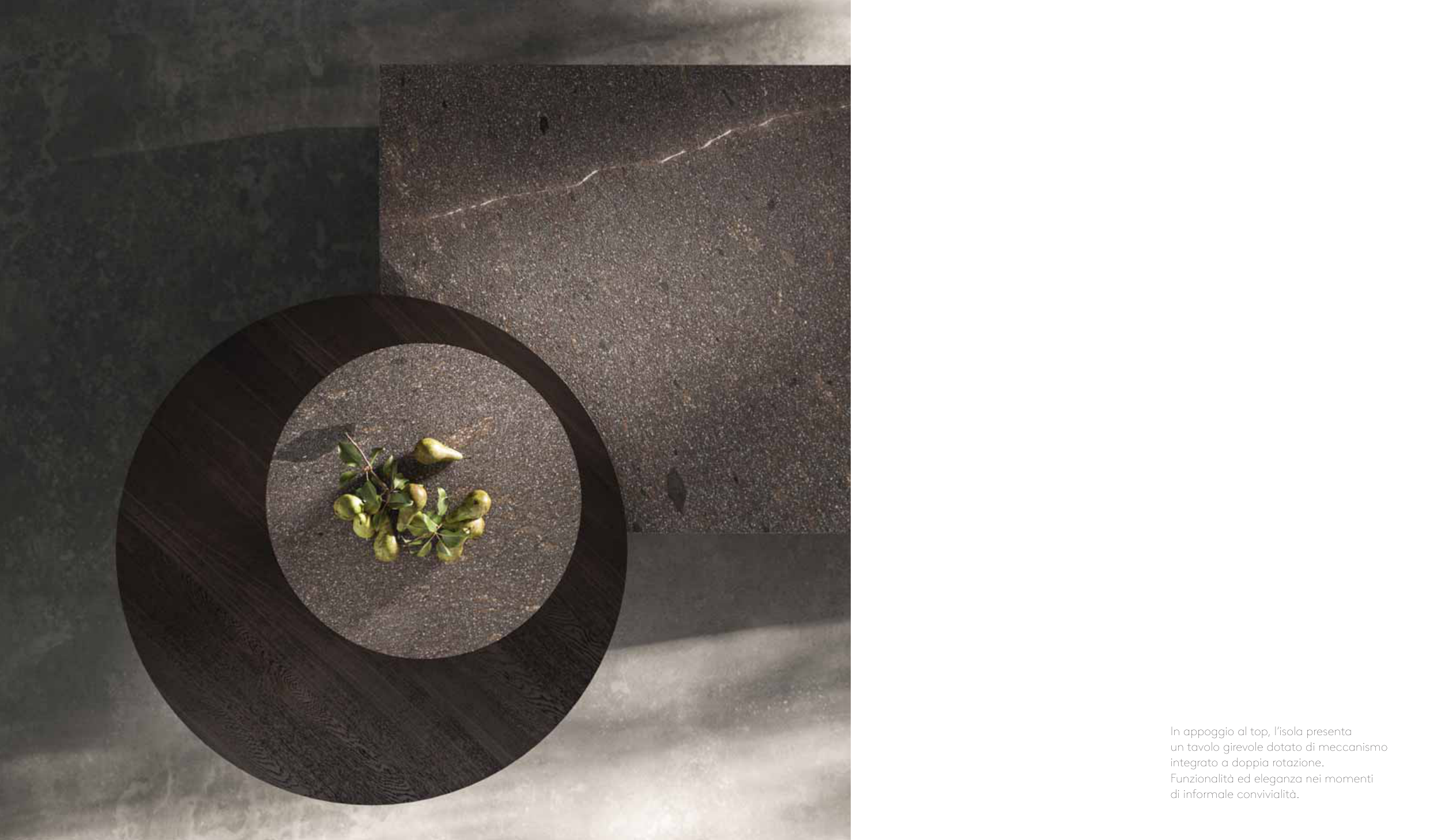 In appoggio al top, l’isola presenta un tavolo girevole dotato di meccanismo integrato a doppia rotazione. Funzionalità ed eleganza nei momenti di informale convivialità.
