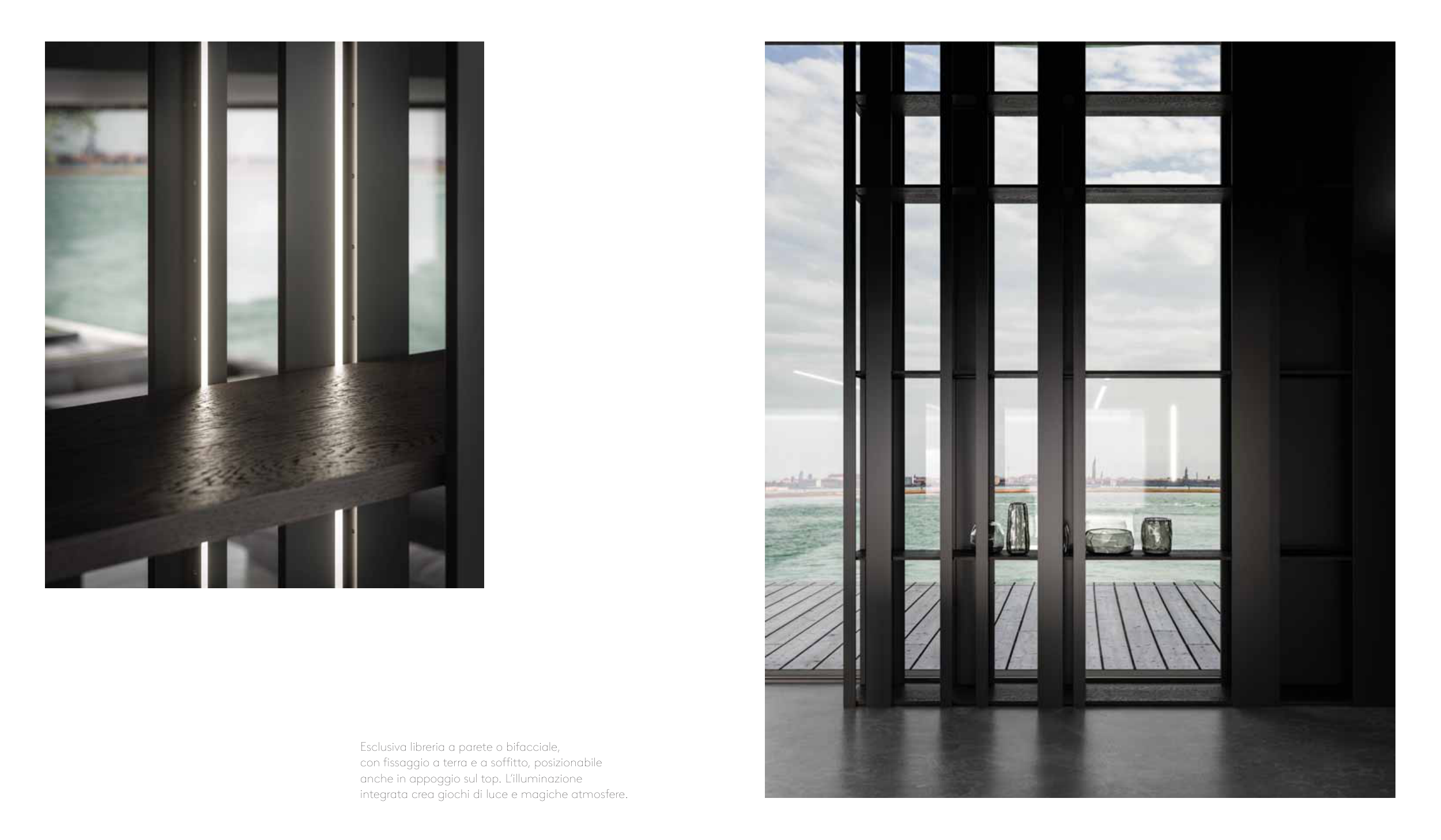 Esclusiva libreria a parete o bifacciale, con �ssaggio a terra e a so�tto, posizionabile anche in appoggio sul top. L’illuminazione integrata crea giochi di luce e magiche atmosfere.