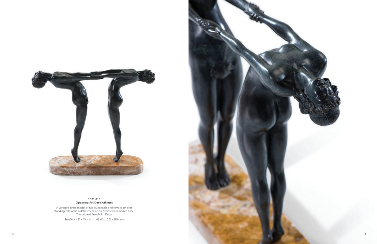 12 13 1021-715 Opposing Art Deco Athletes A verdigris brass model of two nude male and female athletes standing with arms outstretched, on an ovoid cream marble base. The original French Art Deco. 16½ W x 4 D x 15 H in | 42 W x 10 D x 38 H cm