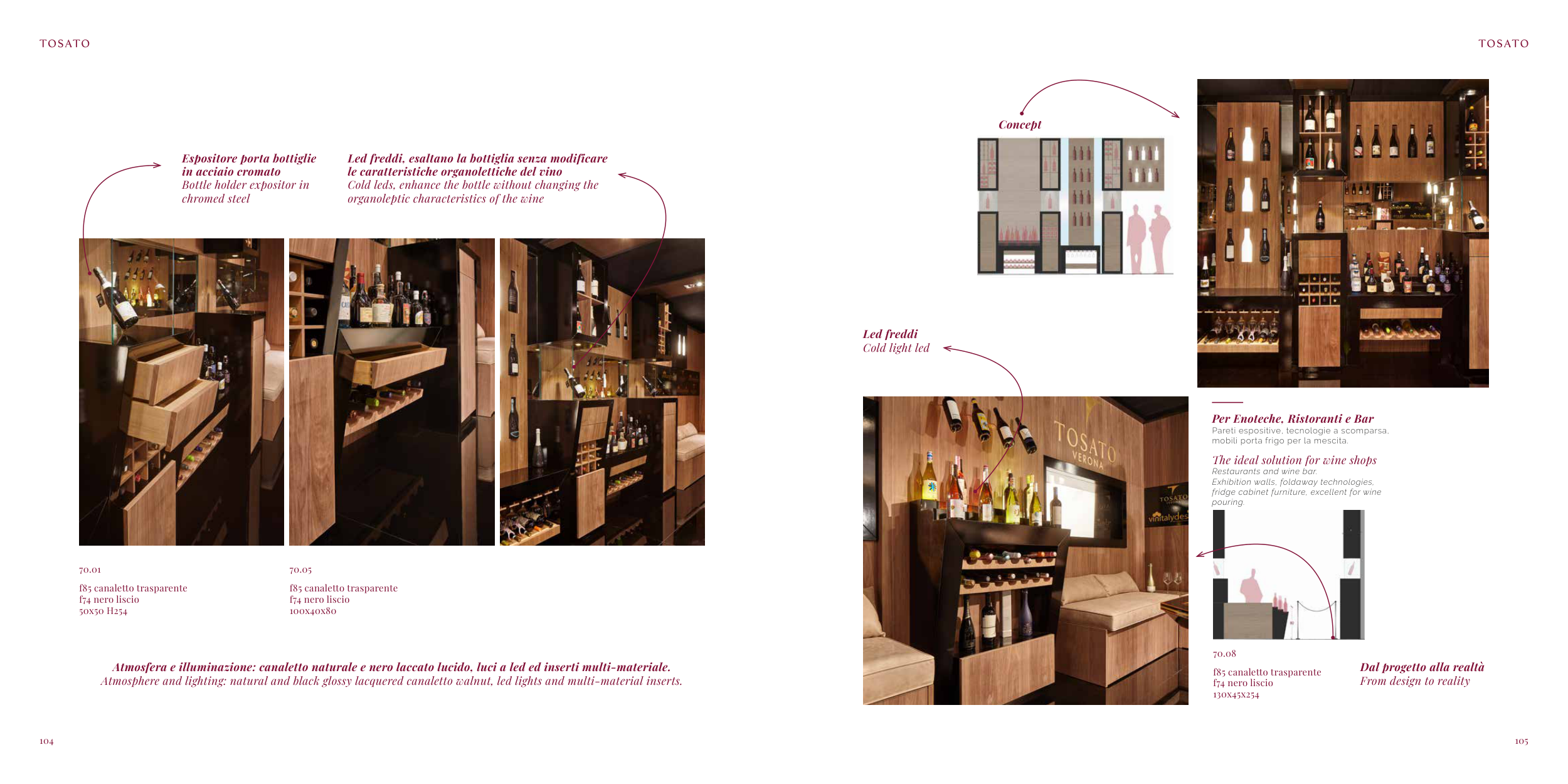 Atmosphere and lighting: natural and black glossy lacquered canaletto walnut, led lights and multi-material inserts.