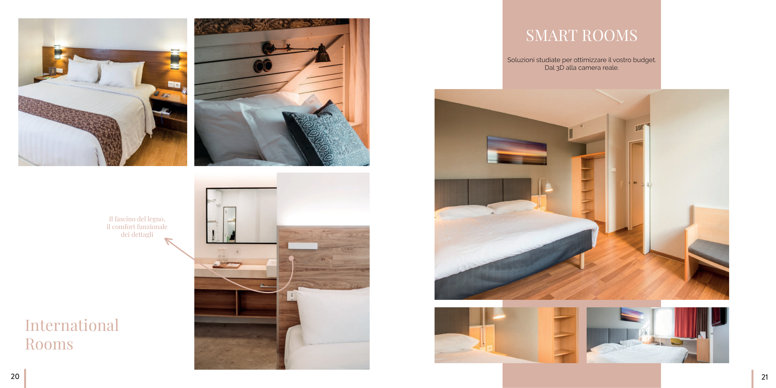 20 21 SMART ROOMS Il fascino del legno, il comfort funzionale dei dettagli International Rooms Soluzioni studiate per ottimizzare il vostro budget. Dal 3D alla camera reale.