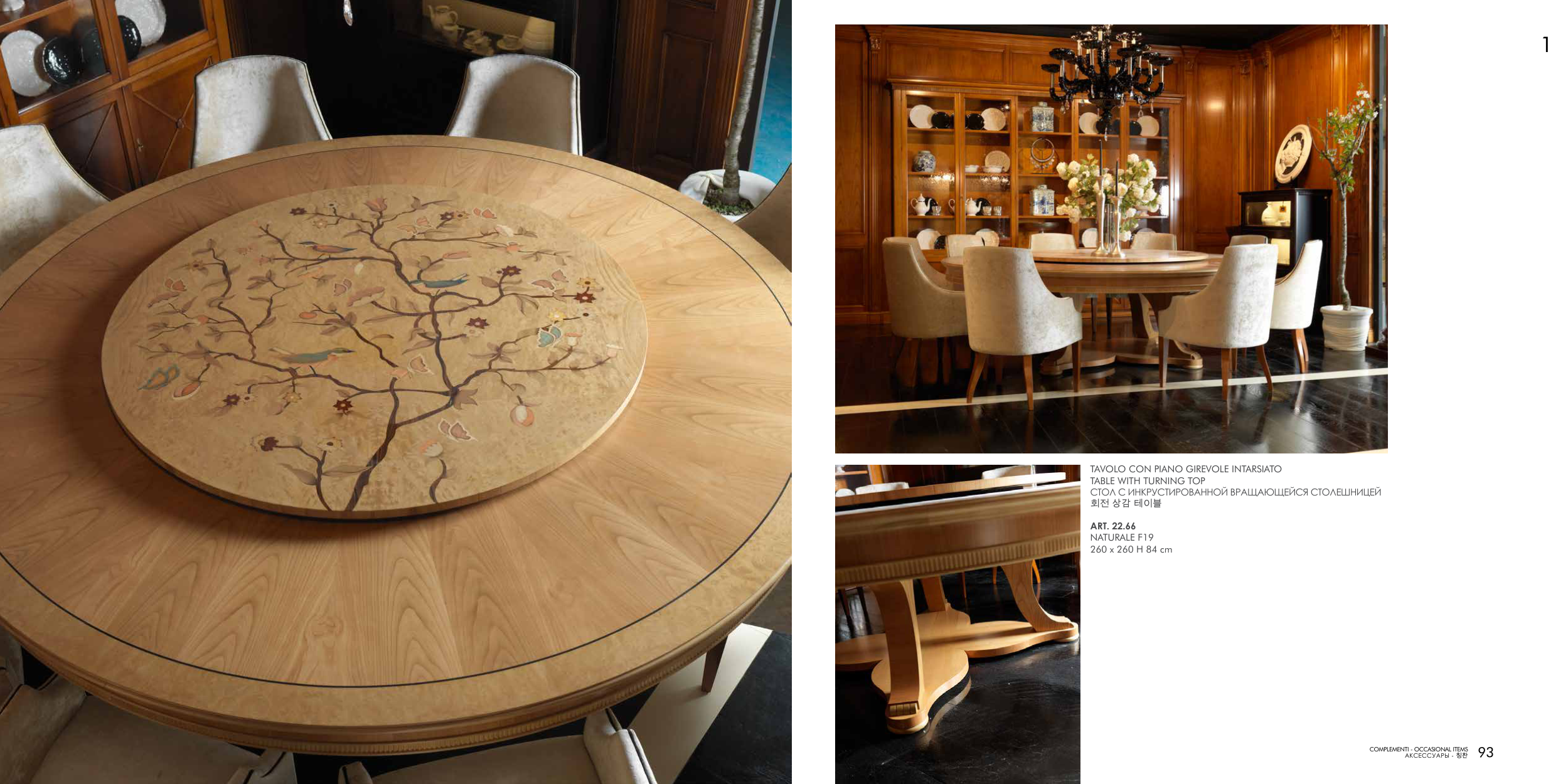 TAVOLO CON PIANO GIREVOLE INTARSIATO TABLE WITH TURNING TOP СТОЛ С ИНКРУСТИРОВАННОЙ ВРАЩАЮЩЕЙСЯ СТОЛЕШНИЦЕЙ 회전 상감 테이블 ART. 22.66 NATURALE F19 260 x 260 H 84 cm 1 93 COMPLEMENTI - OCCASIONAL ITEMS АКСЕССУАРЫ - 칭찬
