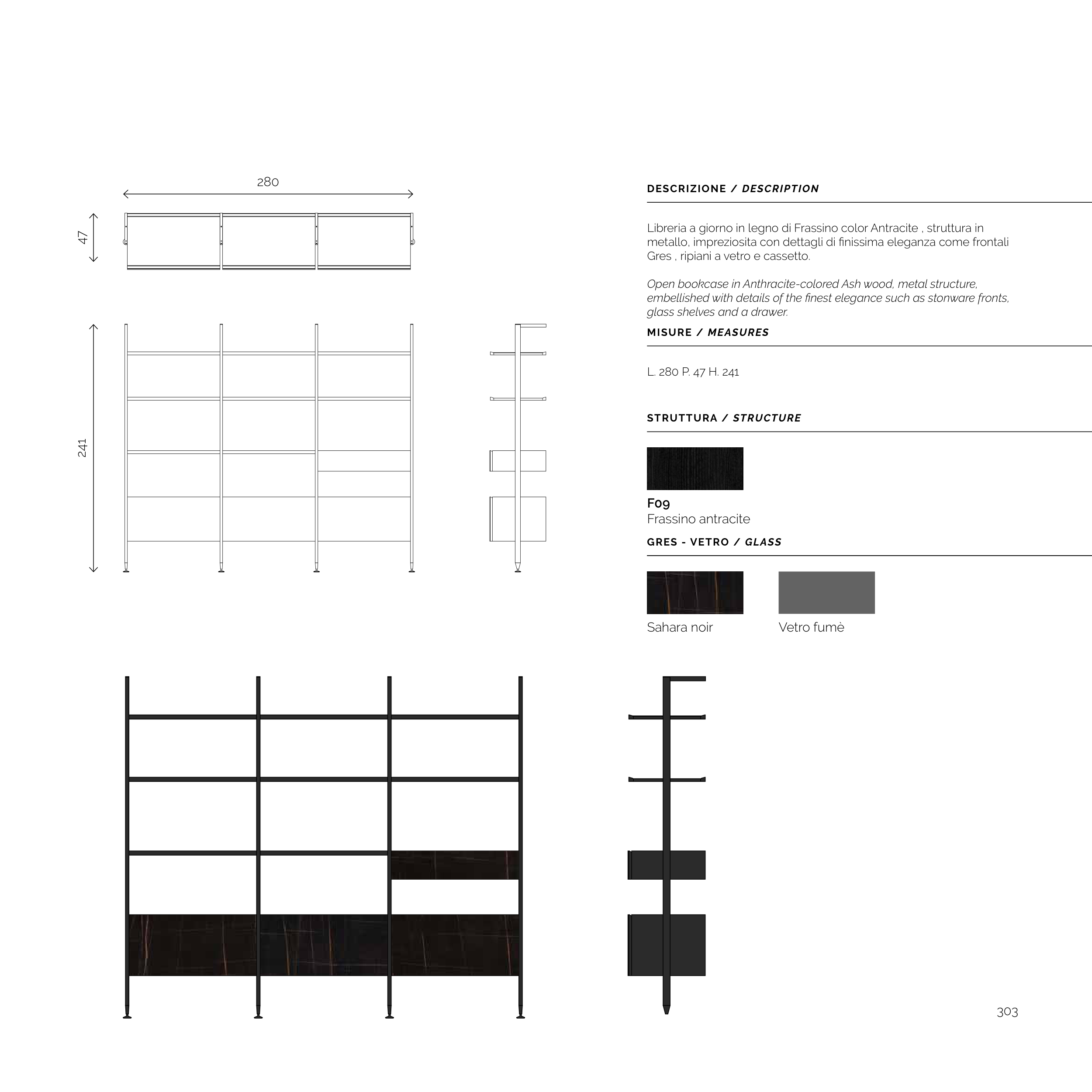 Open bookcase in Anthracite-colored Ash wood, metal structure,