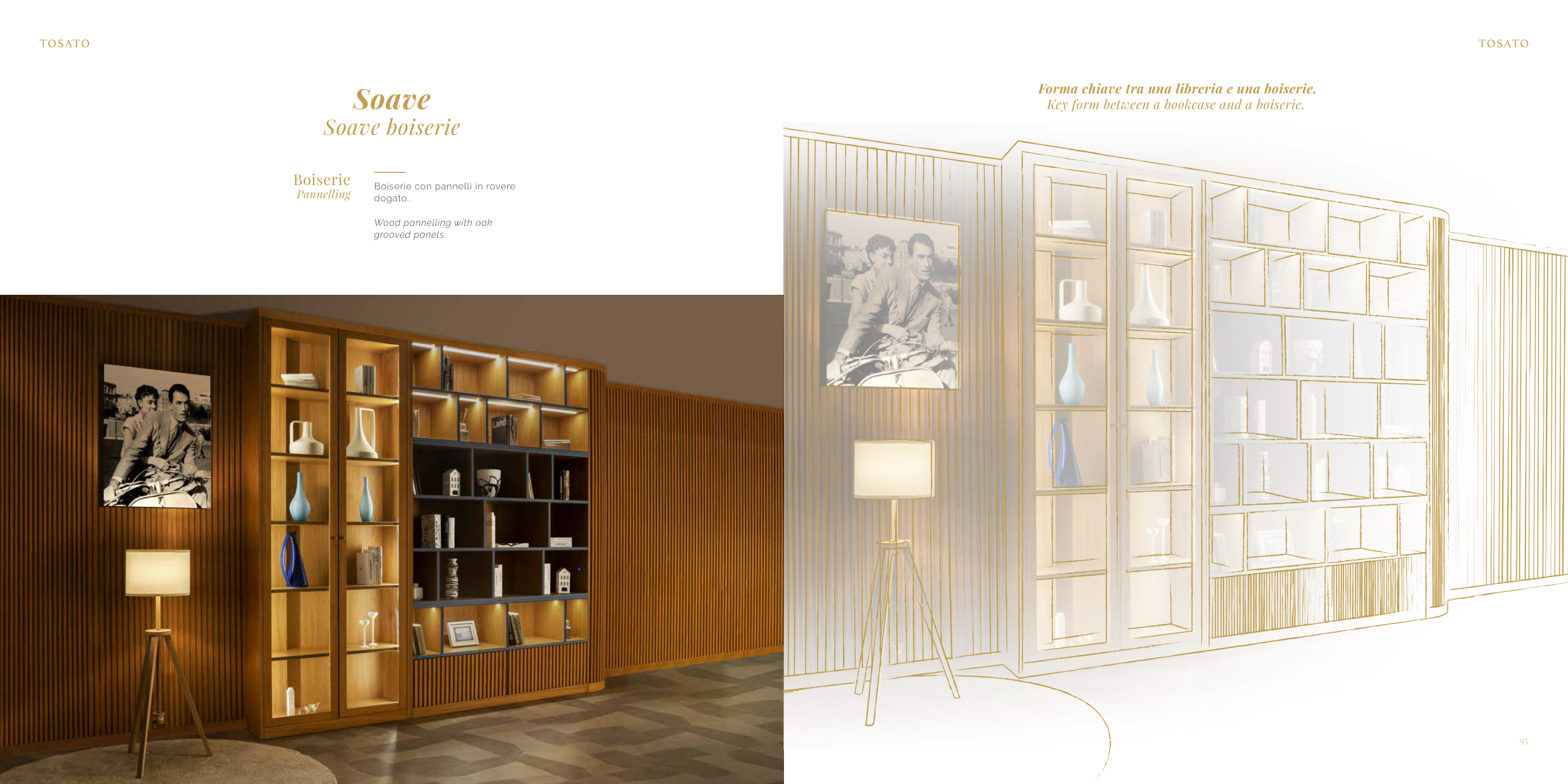 94 95 /zona giorno/living area/lorem ipsum Boiserie con pannelli in rovere dogato.. Wood pannelling with oak grooved panels. Boiserie Pannelling Soave Soave boiserie Forma chiave tra una libreria e una boiserie. Key form between a bookcase and a boiserie.
