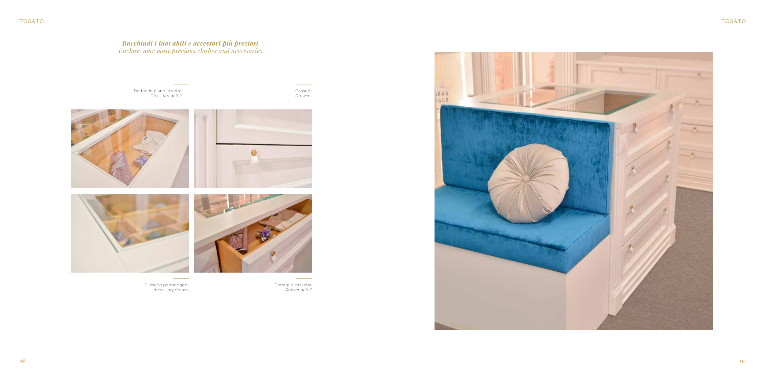 158 159 Cassetti Drawers Dettaglio cassetto Drawer detail Racchiudi i tuoi abiti e accessori più preziosi. Enclose your most precious clothes and accessories. Divisorio portaoggetti Accessory drawer Dettaglio piano in vetro Glass top detail