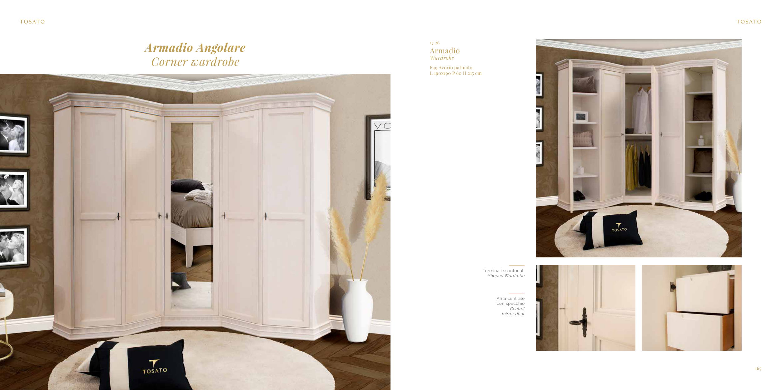 164 165 Armadio Angolare Corner wardrobe 17.26 Armadio Wardrobe F49 Avorio patinato L 190x190 P 60 H 215 cm Anta centrale con specchio Central mirror door Terminali scantonati Shaped Wardrobe