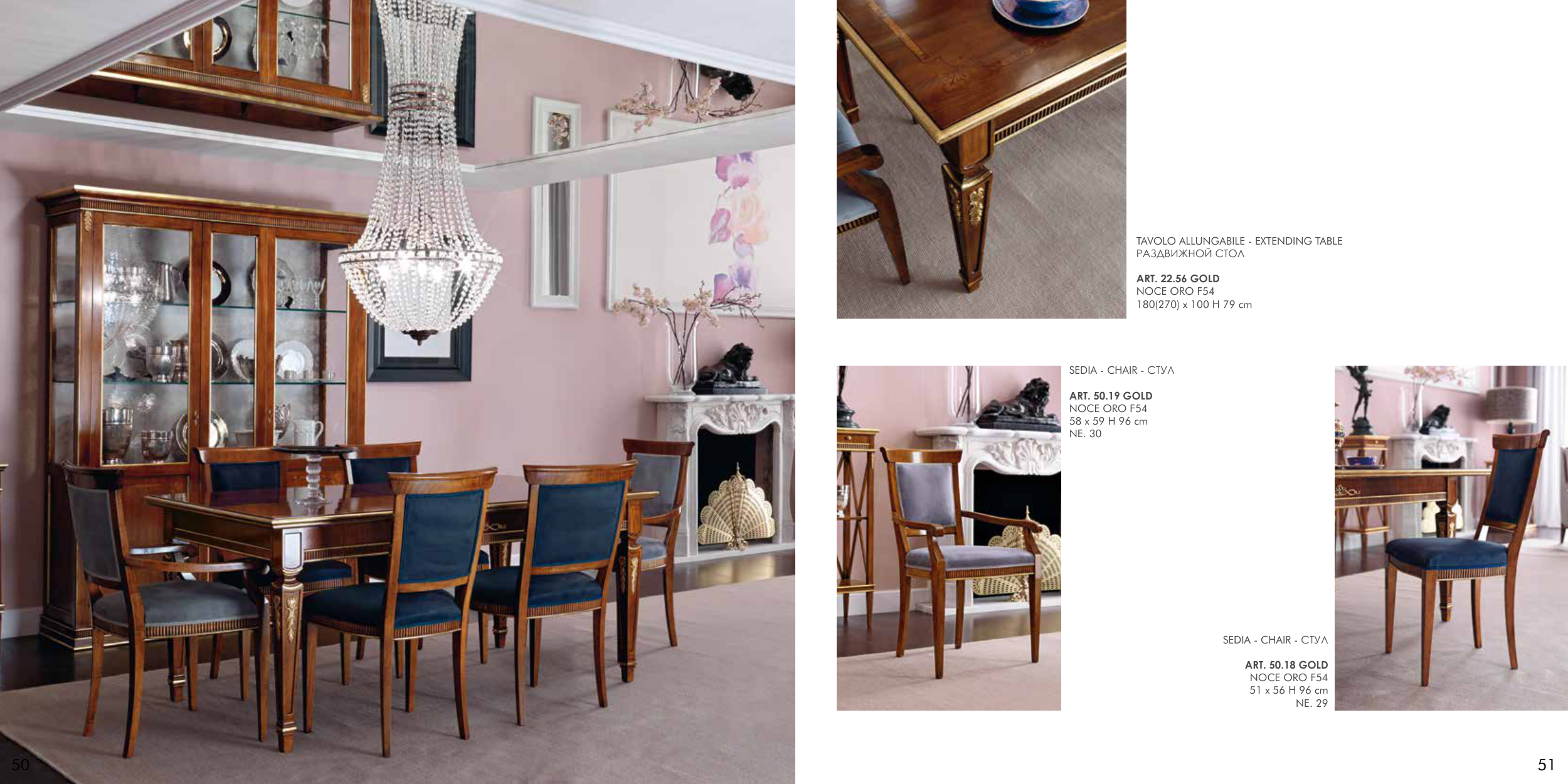 50 51 SEDIA - CHAIR - СТуЛ ART. 50.18 GOLD NOCE ORO F54 51 x 56 H 96 cm NE. 29 SEDIA - CHAIR - СТуЛ ART. 50.19 GOLD NOCE ORO F54 58 x 59 H 96 cm NE. 30 TAVOLO ALLUNGABILE - EXTENDING TABLE РАЗДВИЖНОй СТОЛ ART. 22.56 GOLD NOCE ORO F54 180(270) x 100 H 79 cm