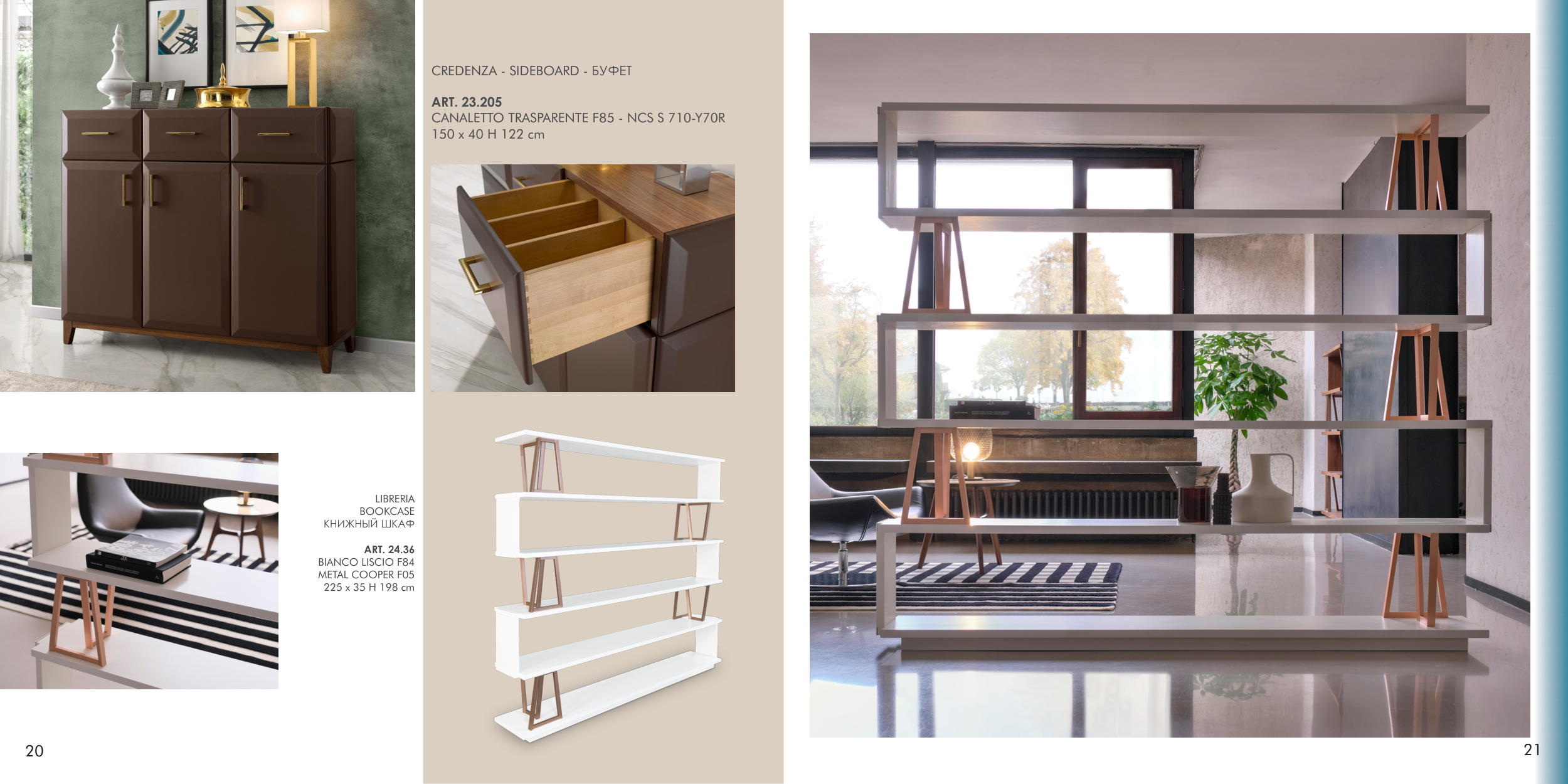 CREDENZA - SIDEBOARD - БУФЕТ ART. 23.205 CANALETTO TRASPARENTE F85 - NCS S 710-Y70R 150 x 40 H 122 cm 20 LIBRERIA BOOKCASE КНИЖНЫЙ ШКАФ ART. 24.36 BIANCO LISCIO F84 METAL COOPER F05 225 x 35 H 198 cm 21