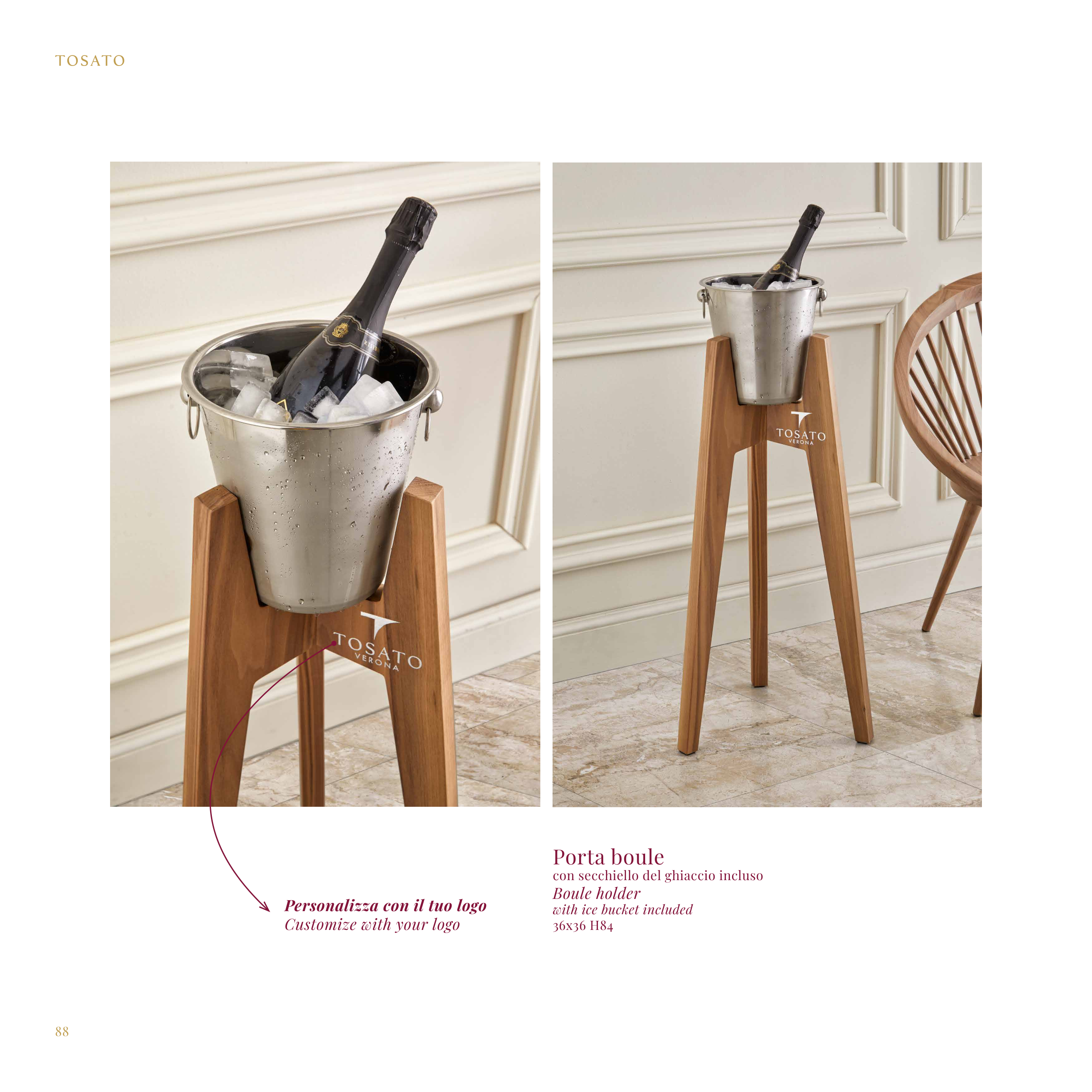 88 Porta boule con secchiello del ghiaccio incluso Boule holder with ice bucket included 36x36 H84 Personalizza con il tuo logo Customize with your logo