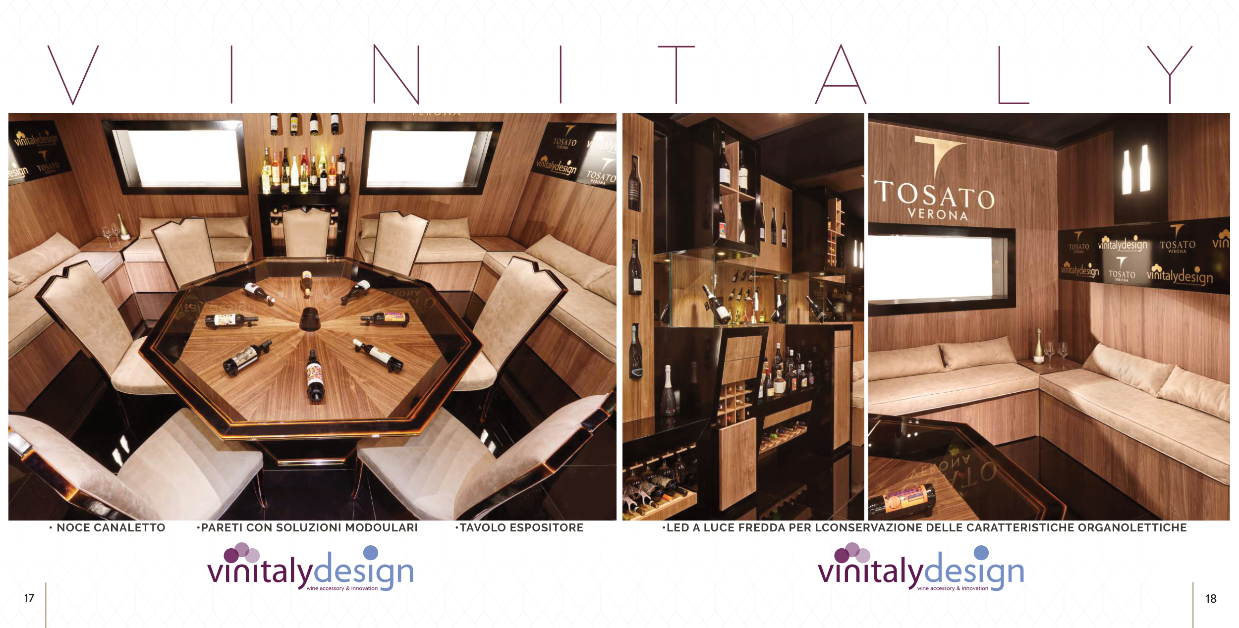 18 17 V I N I T A L Y • NOCE CANALETTO •PARETI CON SOLUZIONI MODOULARI •TAVOLO ESPOSITORE •LED A LUCE FREDDA PER LCONSERVAZIONE DELLE CARATTERISTICHE ORGANOLETTICHE