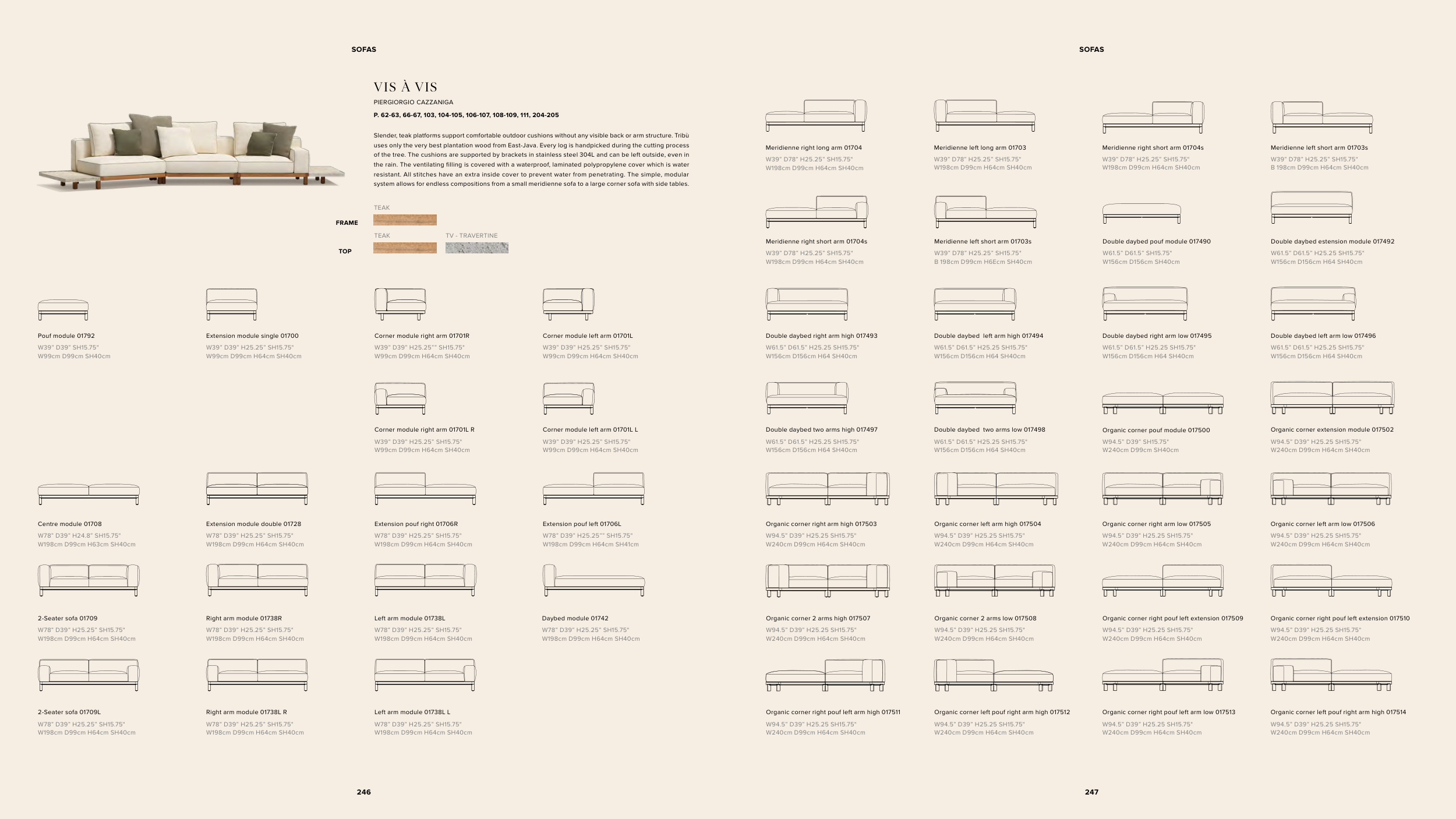 Slender, teak platforms support comfortable outdoor cushions without any visible back or arm structure. Tribù