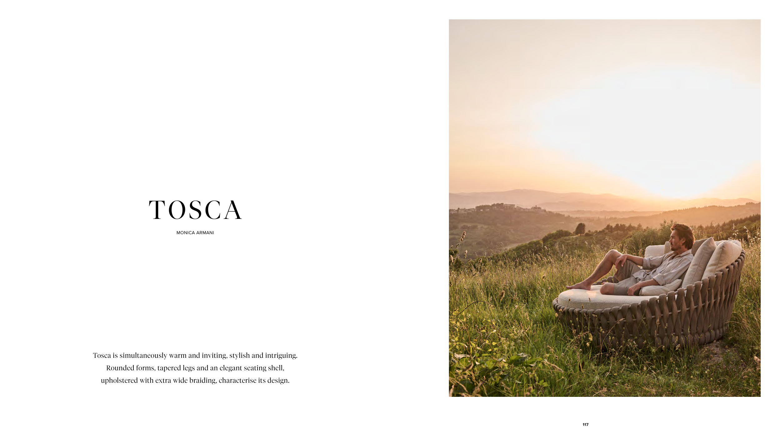 117 MONICA ARMANI TOSCA Tosca is simultaneously warm and inviting, stylish and intriguing. Rounded forms, tapered legs and an elegant seating shell, upholstered with extra wide braiding, characterise its design.