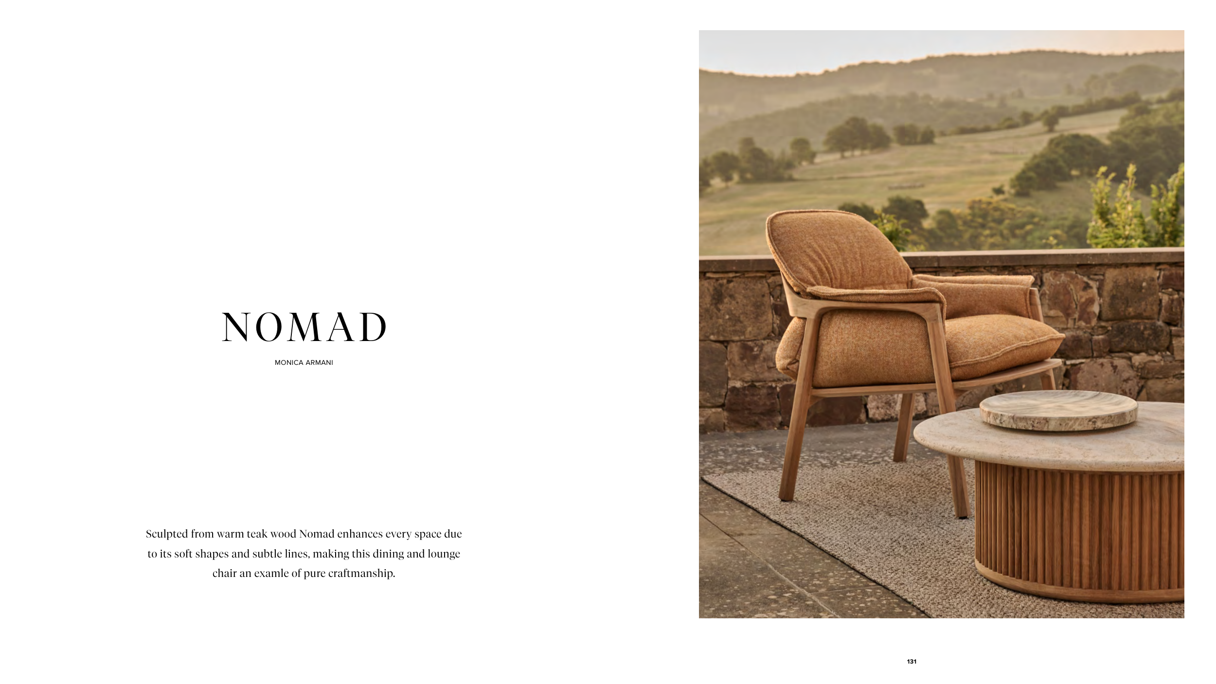 131 Sculpted from warm teak wood Nomad enhances every space due to its soft shapes and subtle lines, making this dining and lounge chair an examle of pure craftmanship. MONICA ARMANI NOMAD