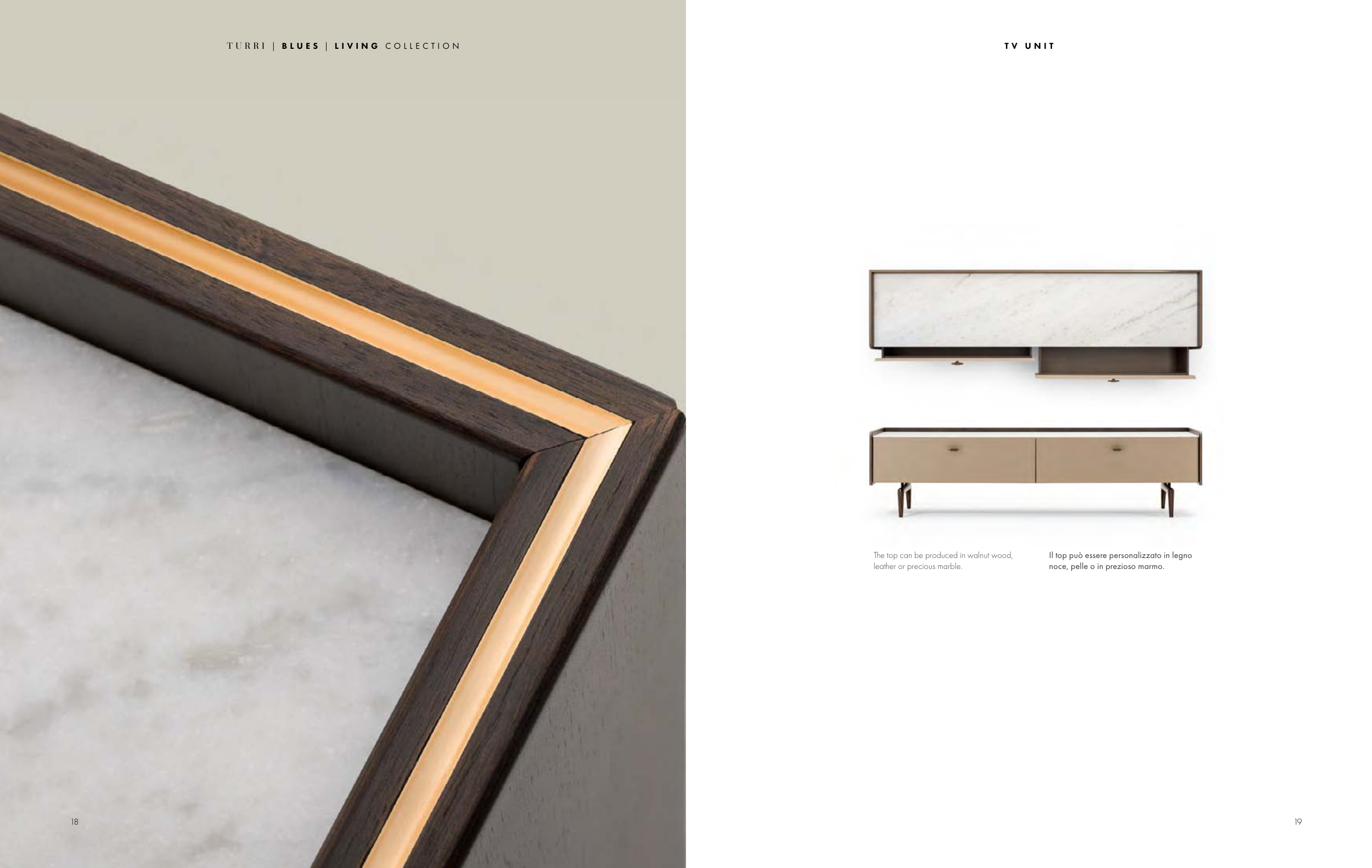 18 T V U N I T 19 T U R R I | B L U E S | L I V I N G C O L L E C T I O N Il top può essere personalizzato in legno noce, pelle o in prezioso marmo. The top can be produced in walnut wood, leather or precious marble.