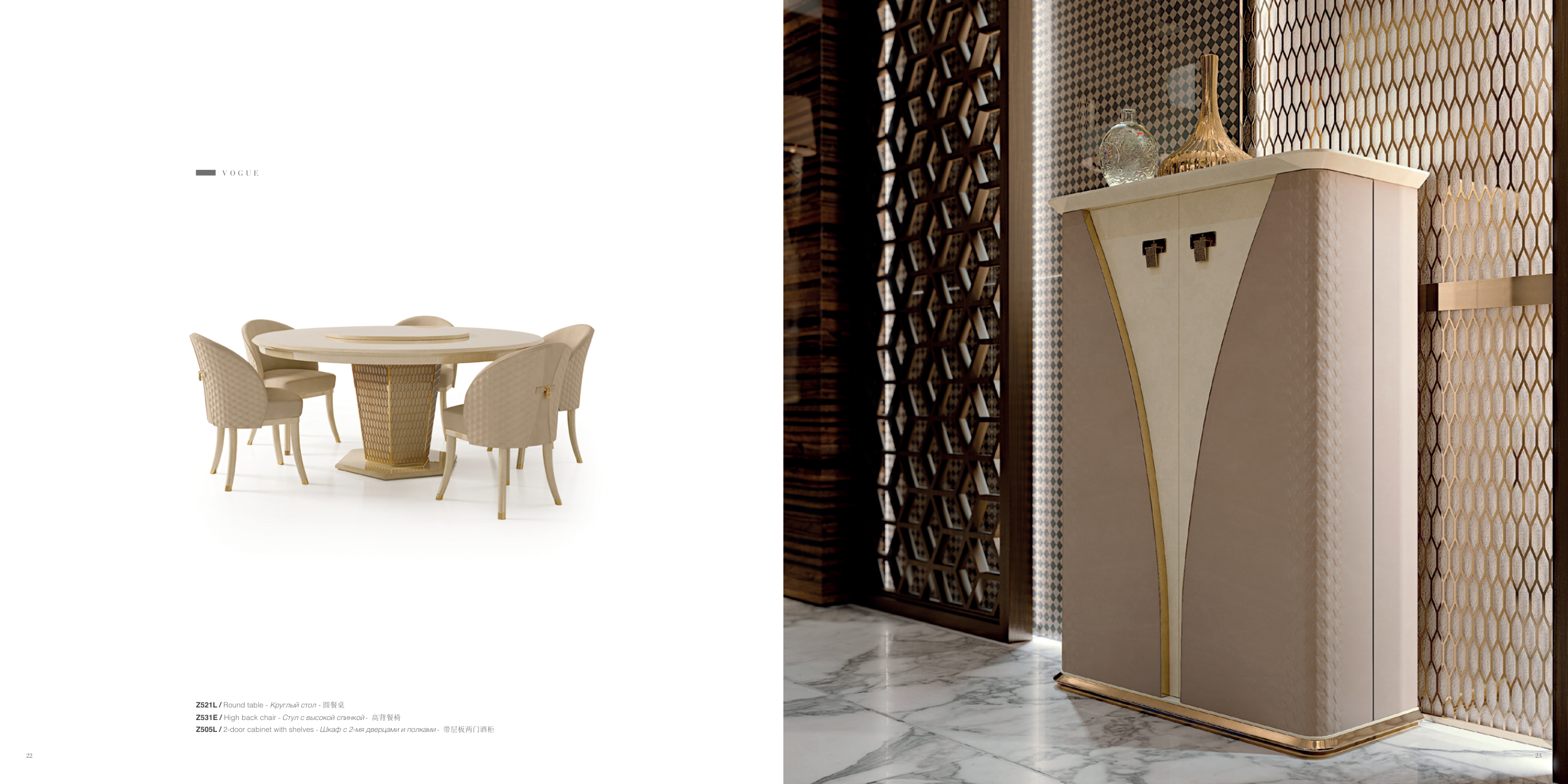 Z521L / Round table - Круглый стол - 圆餐桌 Z531E / High back chair - Стул с высокой спинкой - 高背餐椅 Z505L / 2-door cabinet with shelves - Шкаф с 2-мя дверцами и полками - 带层板两门酒柜 V O G U E 22 23