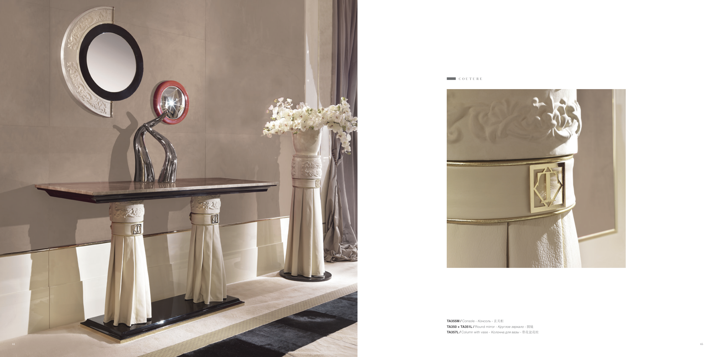 TA355M / Console - Консоль - 玄关柜 TA350 + TA351L / Round mirror - Круглое зеркало - 圆镜 TA357L / Column with vase - Колонна для вазы - 带花盆花柱 C O U T U R E 44 45
