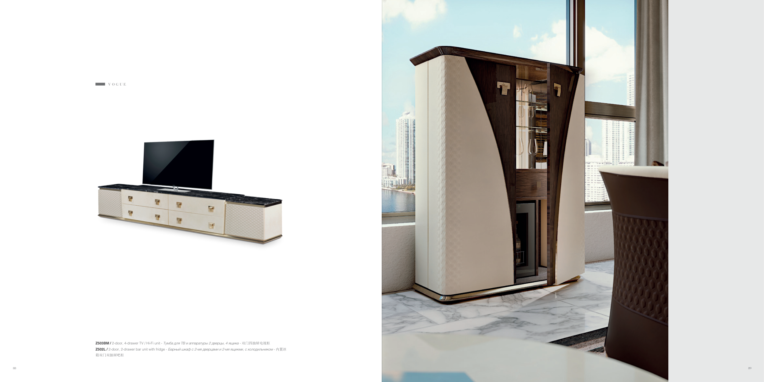 Z503BM / 2-door, 4-drawer TV / Hi-Fi unit - Тумба для ТВ и аппаратуры 2 дверцы, 4 ящика - 双门四抽屉电视柜 Z502L / 2-door, 2-drawer bar unit with fridge - Барный шкаф с 2-мя дверцами и 2-мя ящикми, с холодильником - 内置冰 箱双门双抽屉吧柜 V O G U E 88 89