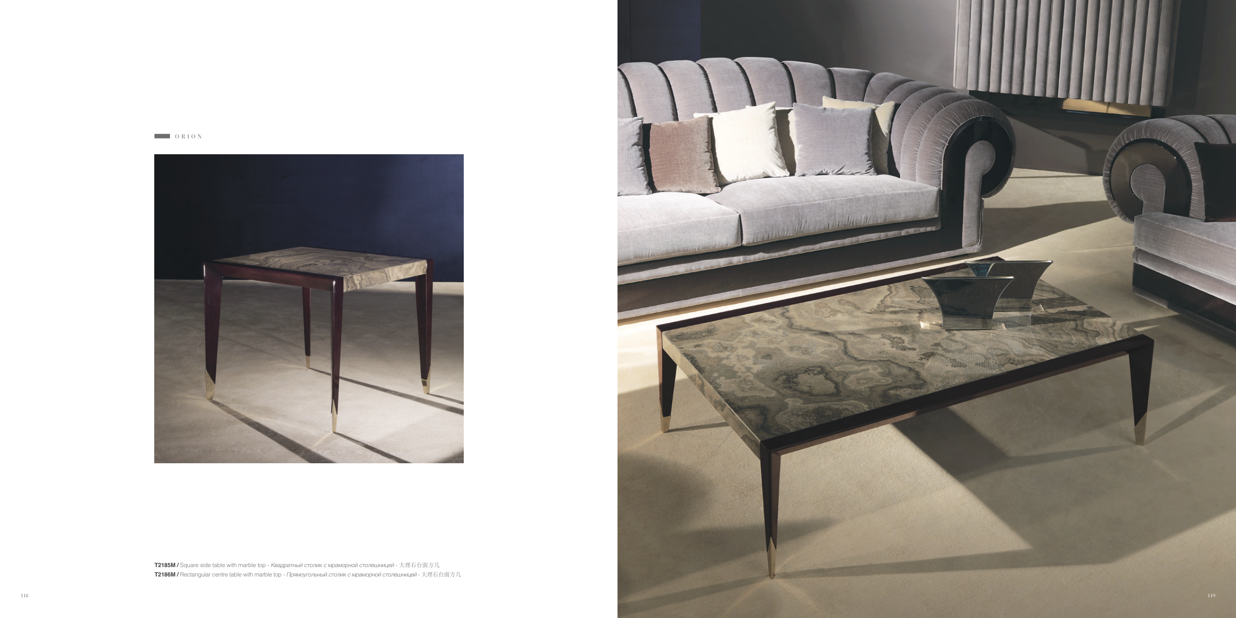 T2185M / Square side table with marble top - Квадратный столик с мраморной столешницей - 大理石台面方几 T2186M / Rectangular centre table with marble top - Прямоугольный столик с мраморной столешницей - 大理石台面方几 O R I O N 118 119