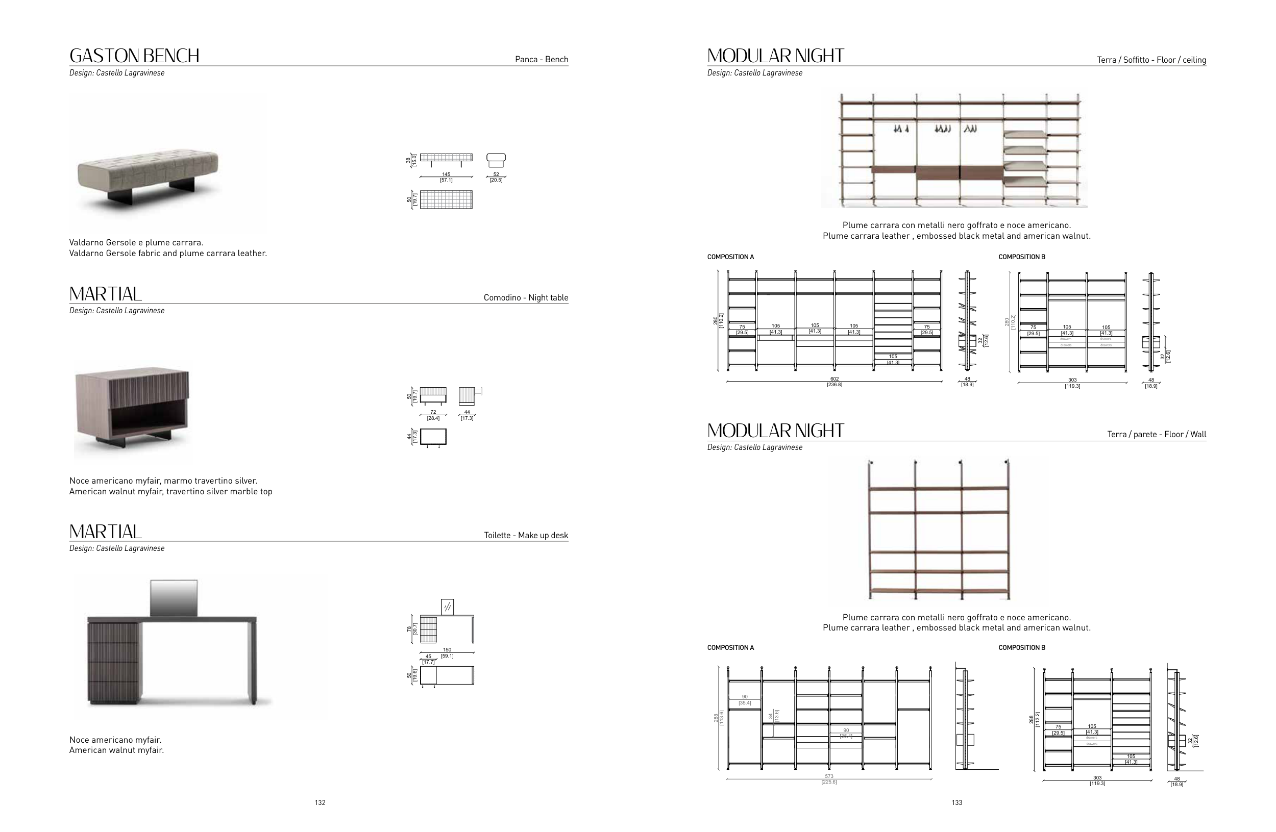 Plume carrara con metalli nero goffrato e noce americano.