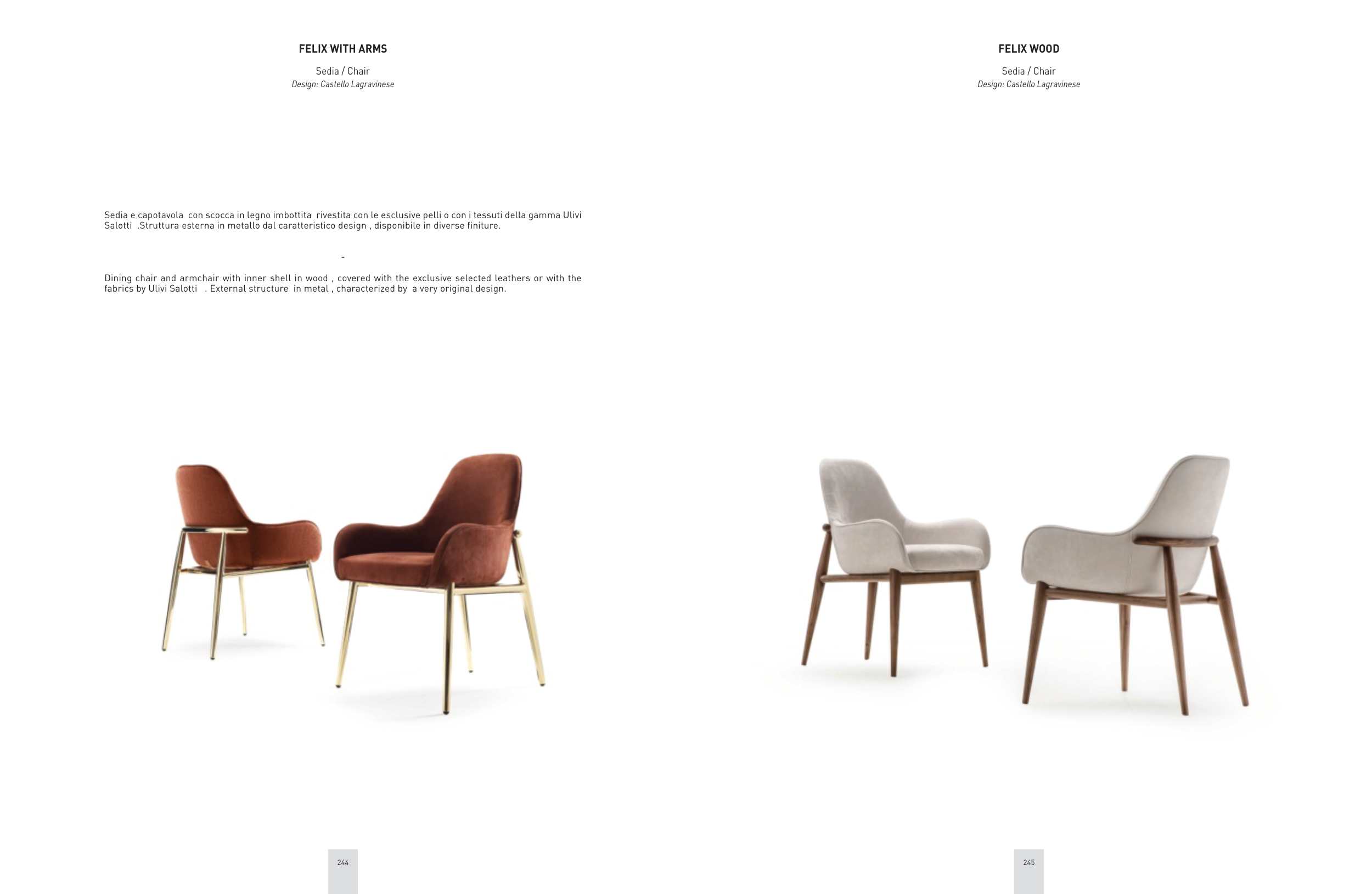 Sedia e capotavola con scocca in legno imbottita rivestita con le esclusive pelli o con i tessuti della gamma Ulivi