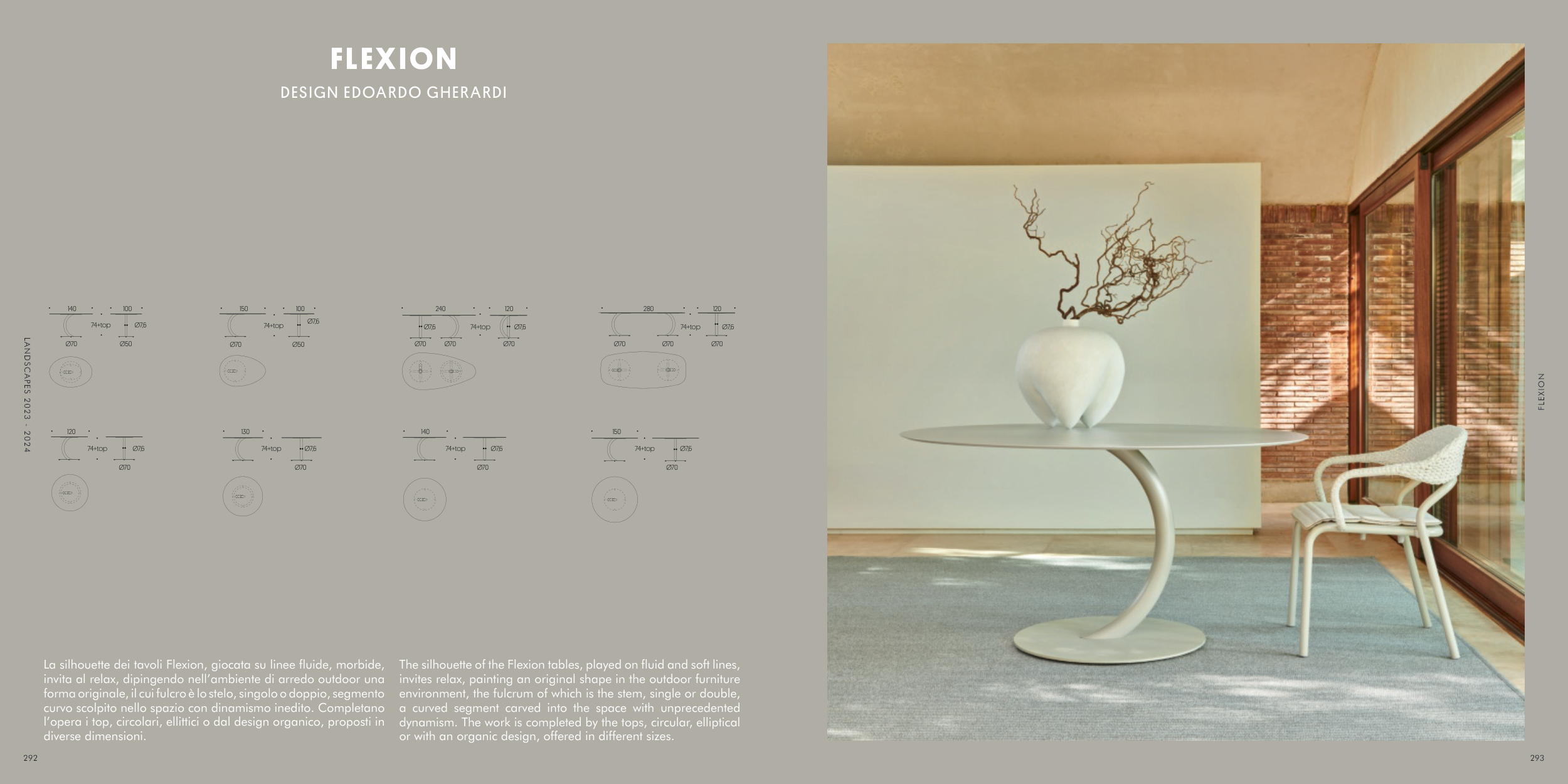 La silhouette dei tavoli Flexion, giocata su linee fluide, morbide,