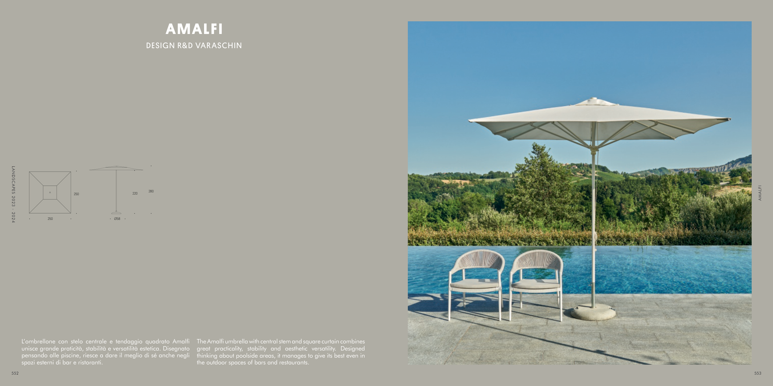 The Amalfi umbrella with central stem and square curtain combines
